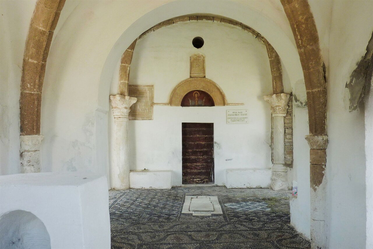 Vor oder nach der Wanderung sollte man auf jeden Fall die Kirche Zoodhochos Piji besichtigen. Sie befindet sich direkt hinter der Taverne. Dort wird man in den Wänden noch antikes Baumaterial entdecken. Geht man 10 m weiter in nördliche Richtung, so stößt man auch auf die Reste eines frühchristlichen Fußbodenmosaiks. Zur Wanderung: Vom (01) Fischrestaurant (10 m) gehen wir zunächst auf der Anfahrtsstraße zurück.