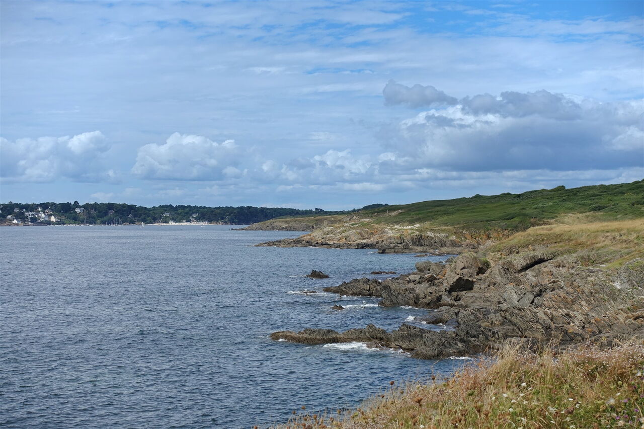 Es folgt ein wilder Küstenabschnitt mit nur wenigen Buchten. Schnell ist der kleine Badeort in der Nähe der Mündung des Belon erreicht, der 05 Plage de Kerfany (7 m). Direkt am schönen Sandstrand entlang oder über den Parkplatz erreichen wir am nördlichen Ende der Bucht ein Metallgitter. Wir folgen diesem und erreichen eine aussichtsreiche Landspitze. Über Wiesen steigen wir zur Straße auf, um dort links zu laufen und hinter dem Ehrendenkmal die Treppen herunterzugehen. Im weiteren Verlauf wird mehrmals auf- und abgestiegen. Nach einem kurzen Stück parallel zu einem Parkplatz biegen wir bei der nächsten Möglichkeit nach halb rechts ab und erreichen den Ausgangspunkt.