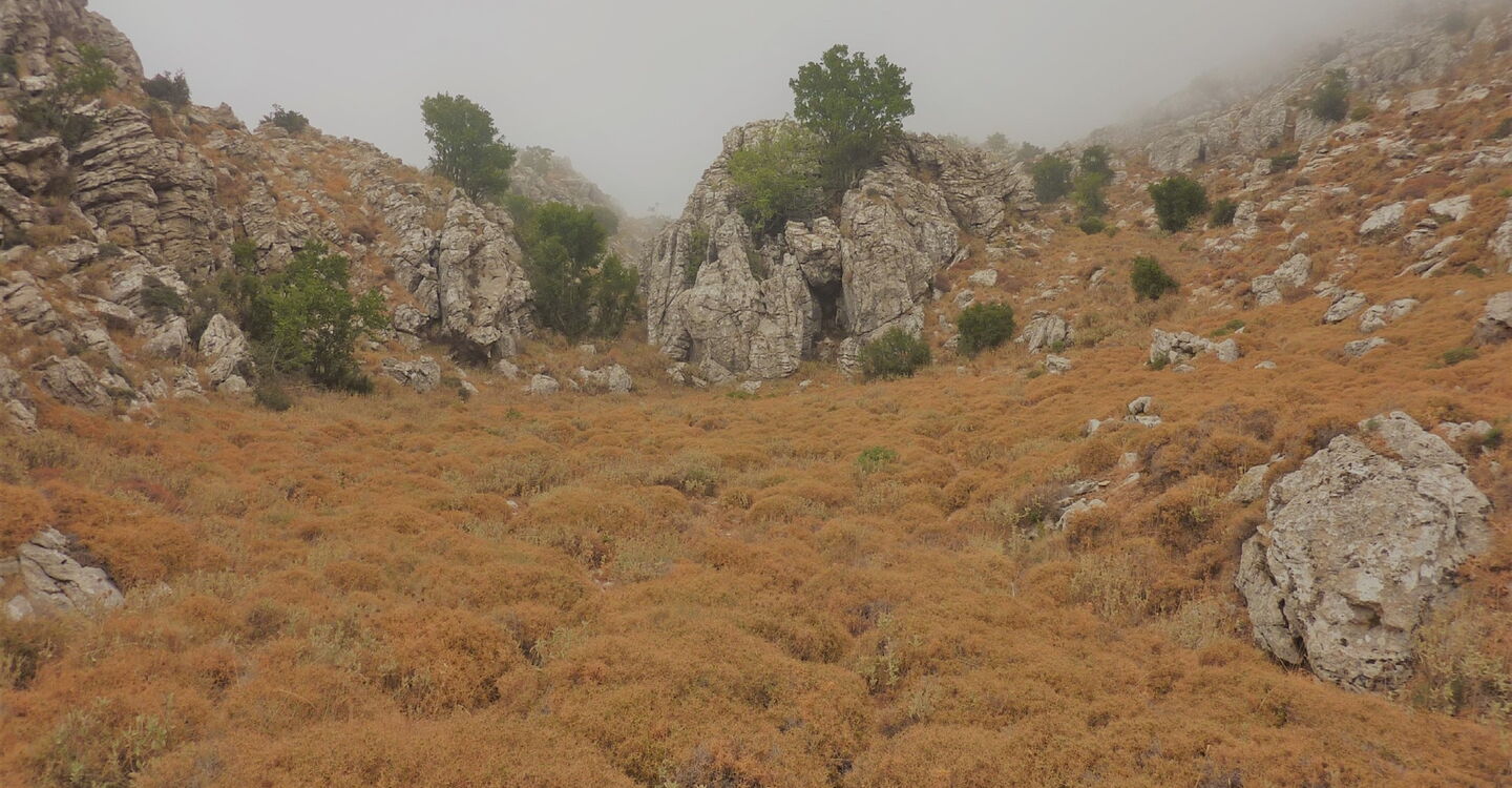 Nach 680 m – auf dem höchsten Punkt einer kleinen Höhe – biegen wir rechts ab und gehen auf dieser Piste 1,8 km bis zur 04 Schlüsselstelle eins (722 m), ein komplett wegloses Stück bis zu einer Ziegenhaltung. Wir erreichen eine kleine Ebene, auf der sich eine große Eiche befindet. Auf Höhe dieser Eiche verlassen wir die Linkskehre der Piste und gehen auf eine Art Mauer zu. Dahinter gelangen wir in eine kleine Senke und wandern über nicht bewirtschaftete Terrassenfelder auf eine weitere Eiche zu, um dann bei einer weiteren nachfolgenden Eiche rechts steil abzusteigen – in Richtung der Terrassenfelder im Tal. Ausgerichtet auf einen vereinzelt stehenden Baum gehen wir am Zaun entlang, um ein Terrassenfeld zu queren und einen Ziegenzaun zu öffnen und zu verschließen. Auf einem Ziegenpfad geht es durch ein kleines Waldstück, bis wir links oberhalb stehende Mauerreste mittig queren, eine Anhöhe übersteigen, auf vielen Ziegenfaden in südliche Richtung bergab gehen und in der Ferne eine Ziegenhaltung mit einem roten Dach erkennen.
