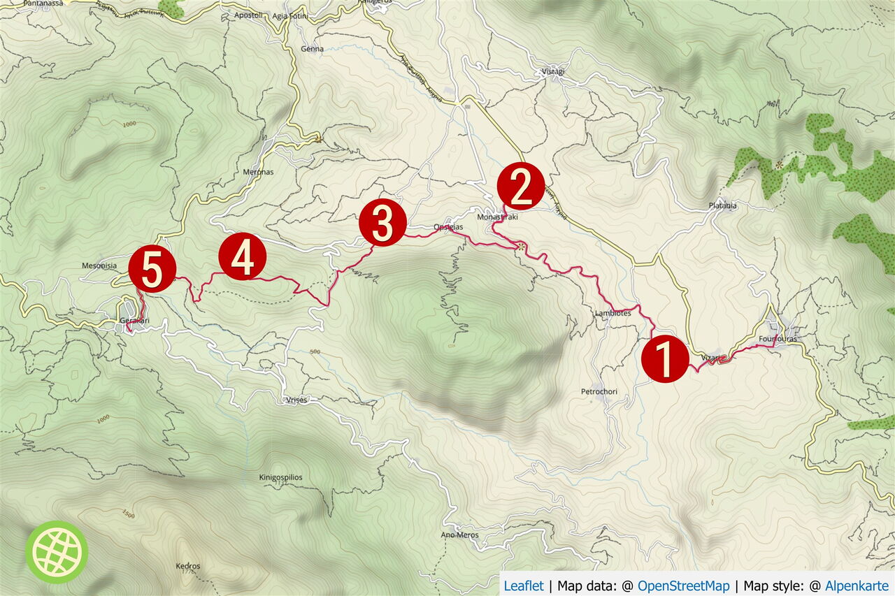 Charakter: Von der Navigation her eine der schwierigsten Etappen des E4-Wanderwegs. Das Stück zwischen den Wegpunkten 4 und 5 ist komplett zugewachsen und nur sehr schwer auszumachen. Art des Weges: 30 % Pfad, 50 % Schotterpiste und 20 % Asphaltstraße. Zusatzausrüstung: lange Hosen für das dichte Buschwerk zwischen den Wegpunkten 4 und 5. Einkehrmöglichkeiten: keine auf der Wanderung. Quelle: GPS 35.226505 24.660022. In Geraki ist die Taverne Apsisa sehr empfehlenswert. Beste Wanderzeit: ganzjährig. Variante: Lässt man den Besuch des palastartigen Komplexes von Monastiraki aus, so reduziert sich die Gesamtwegstrecke um 2,4 km.
