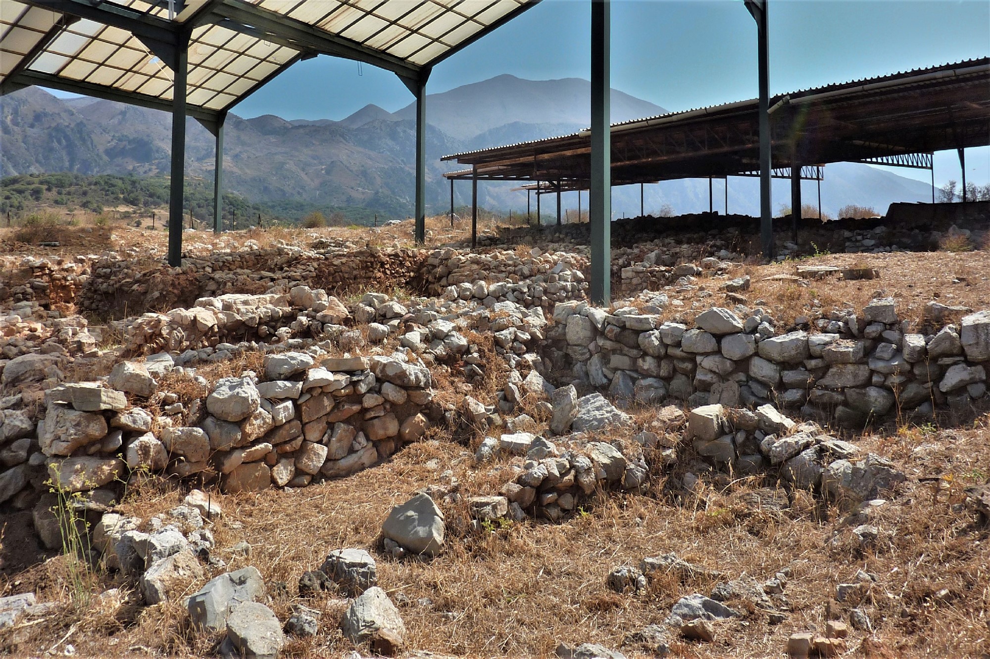An der Weggabelung gehen wir halb links weiter, anschließend bei der nächsten Möglichkeit rechts, um nun parallel zum Wasserreservoir zu laufen. An dessen Ende bei der Weggabelung halten wir uns halb links. Nach 460 m überqueren wir eine Brücke nach links und erreichen das Dorf Lampiotes. Dort bleiben wir bei dem ersten Verkehrsspiegel auf der Hauptstraße und bei dem zweiten Verkehrsspiegel gehen wir geradeaus weiter. Nach 2,5 km erreichen wir einen Eichenwald, von links mündet eine Piste auf den Hauptweg – unser weiterer Weg, wenn wir nicht die Exkursion zum 02 palastartigen Komplex (352 m) machen. Nach weiteren 70 m gehen wir halb rechts auf dem mit einem roten Punkt markierten Pfad. Wir kommen an einer Quelle vorbei und gehen rechts durch das Dorf Monastiraki, um dann bei dem blau-grün gestrichenen Geländer rechts hinunter zu den Ruinen eines minoischen Palasts aus der Zeit von 1900 bis 1700 vor Christi zu gehen. Achtung! Die Anlage ist montags geschlossen.