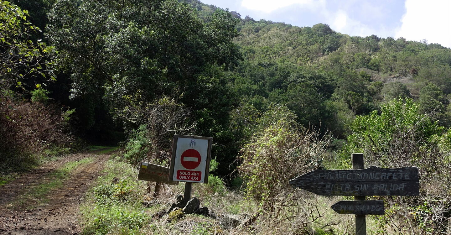 Busanbindung keine: Pkw-Anfahrt: Der Ausgangspunkt der Wanderung befindet sich 26 km von Valverde entfernt. Von dort fährt man auf der HI-1 Richtung San Andres, quert das zentrale Bergmassiv und fährt bergab Richtung Frontera. In einer Rechtskehre der Straße folgt man der Ausschilderung links Richtung Fuente Mencafete. Die Piste endet an einer Weggabelung, an der es links mit einem Vierradantrieb direkt zur Quelle geht. An dieser Stelle kann man nach 20 m bergauf bequem parken. Es führt auch noch eine Piste extrem steil bergauf von Sabinosa, aber von der Anfahrt aus dieser Richtung ist abzuraten. Geokoordinaten: 27.736367 -18.080483.