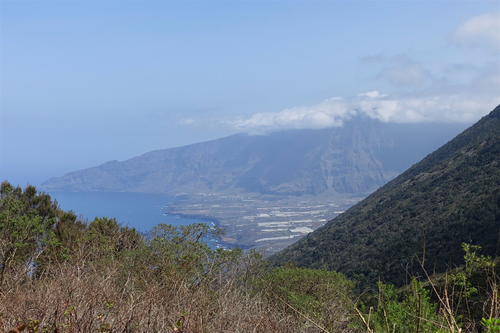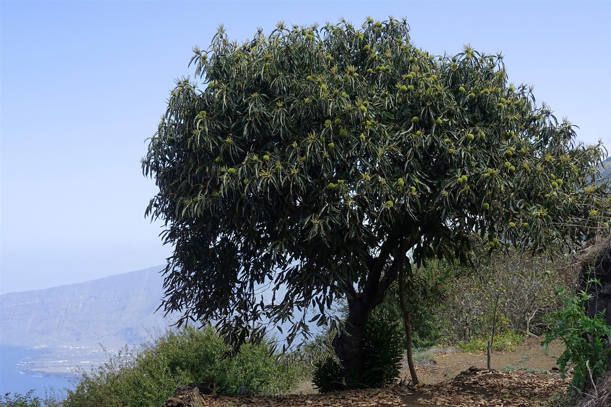 Kurz hinter einem grünen Gatter verlassen wir die Schotterpiste nach halb rechts. Auf dem (02) Camino Sabinosa (816 m), einem historischen Verbindungsweg zwischen den Orten Sabinosa und El Pinar, gehen wir bergab Richtung Pozo de La Salud. Obstbäume und üppiges Grün am Wegesrand zeugen von reichlich Wasservorkommen. Auch gibt der Wald immer wieder den Blick auf den Atlantischen Ozean und die umliegende Bergwelt frei.