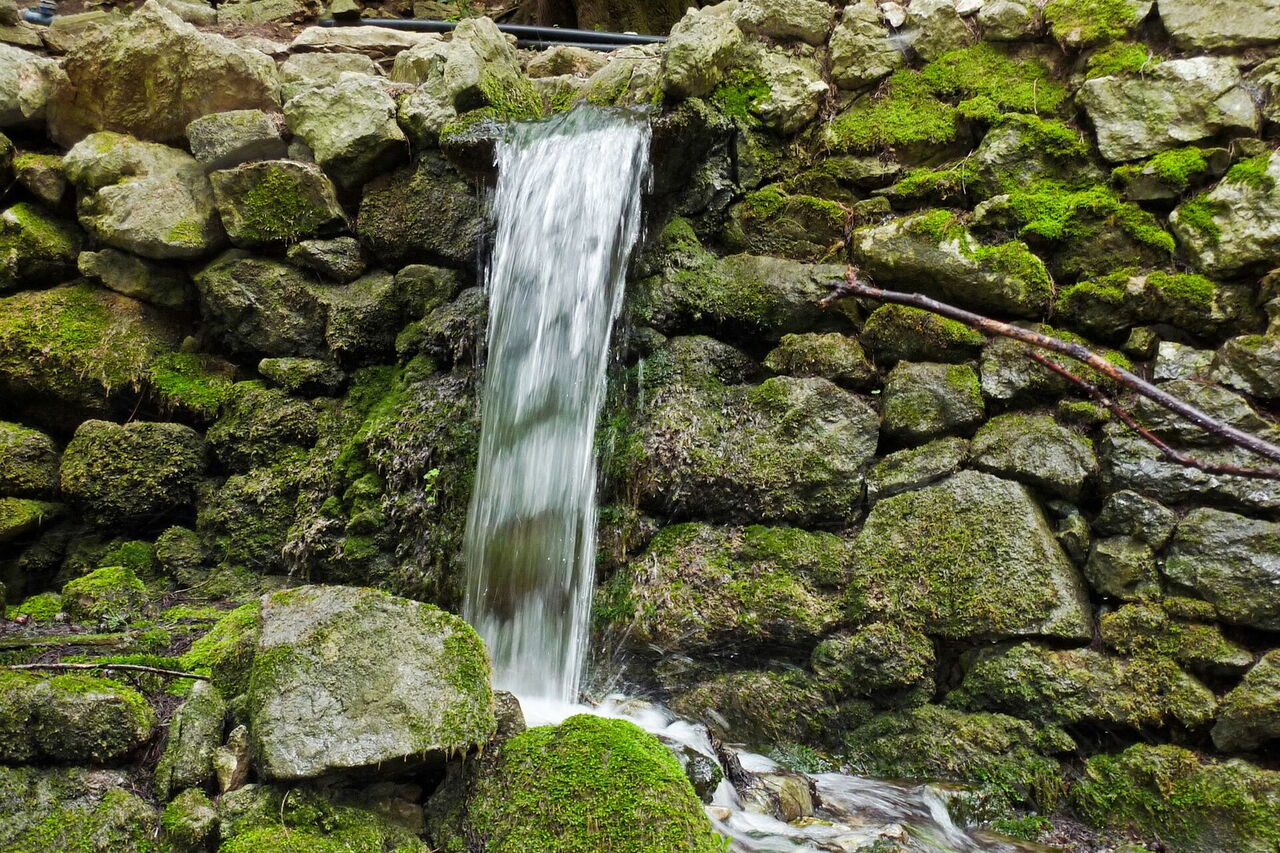 Nur einige Meter weiter rechts, etwas unterhalb, befindet sich die Quelle zur (03) Wasserversorgung (581 m). Auch heutzutage wird sie noch für das Hotel verwendet. Teilweise sehen wir auch links des Weges in den Berg geschlagene Tunnel. Diese dienten zur Unterbringung des Proviants, so war er in den heißen Sommermonaten gut gekühlt.