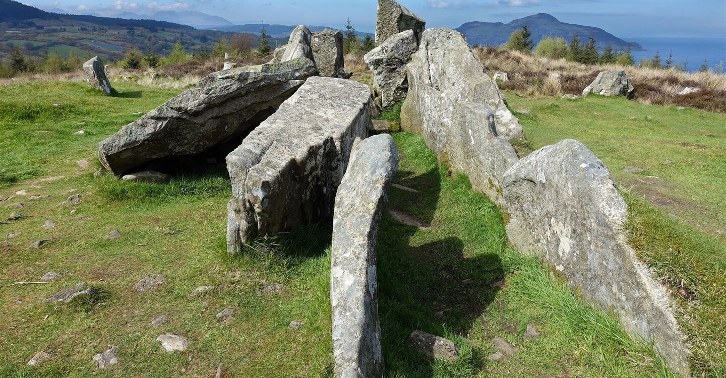 Nach 550 m, wir haben bereits die letzten Häuser hinter uns gelassen, gehen wir links in Serpentinen auf einem angelegten Weg bergauf, bis wir bei einer kleinen Lichtung auf die 02 Giants’ Graves (128 m) und Informationstafeln treffen. Im vorderen Bereich befindet sich eine Megalithanlage und kurz dahinter die Reste einer weiteren Kammer. Bei Ausgrabungen wurden in der hinteren Kammer Feuersteinmesser, zerscherbte Keramik, Pfeilspitzen und verbrannte Knochenreste gefunden.