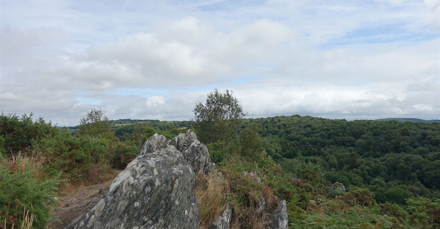 Bei einer Weggabelung – nach links ist der Pfad weiß-rot ausgestrichen – gehen wir halb rechts auf einem wunderschönen Höhenweg direkt durch die steilen Hänge oberhalb der Schlucht 02 Gorges du Daoulas (230 m). Zwischen Ginster und Heideflächen erreichen wir einen mit Holz gesicherten spektakulären Aussichtspunkt. Man blickt tief in die Schlucht bis zur Straße herunter und weit über die sanft hügelige Landschaft, rechts sieht man die Abtei. Der Pfad gibt den weiteren Weg vor. Wir ignorieren zwei rechte Abzweiger zur Straße herunter. Im weiteren Verlauf folgen wir der Ausschilderung Richtung Laniscat. Durch beinahe alpines Terrain steigen wir bis zu einem Bergkamm auf, weitere wunderschöne Aussichtspunkte folgen.