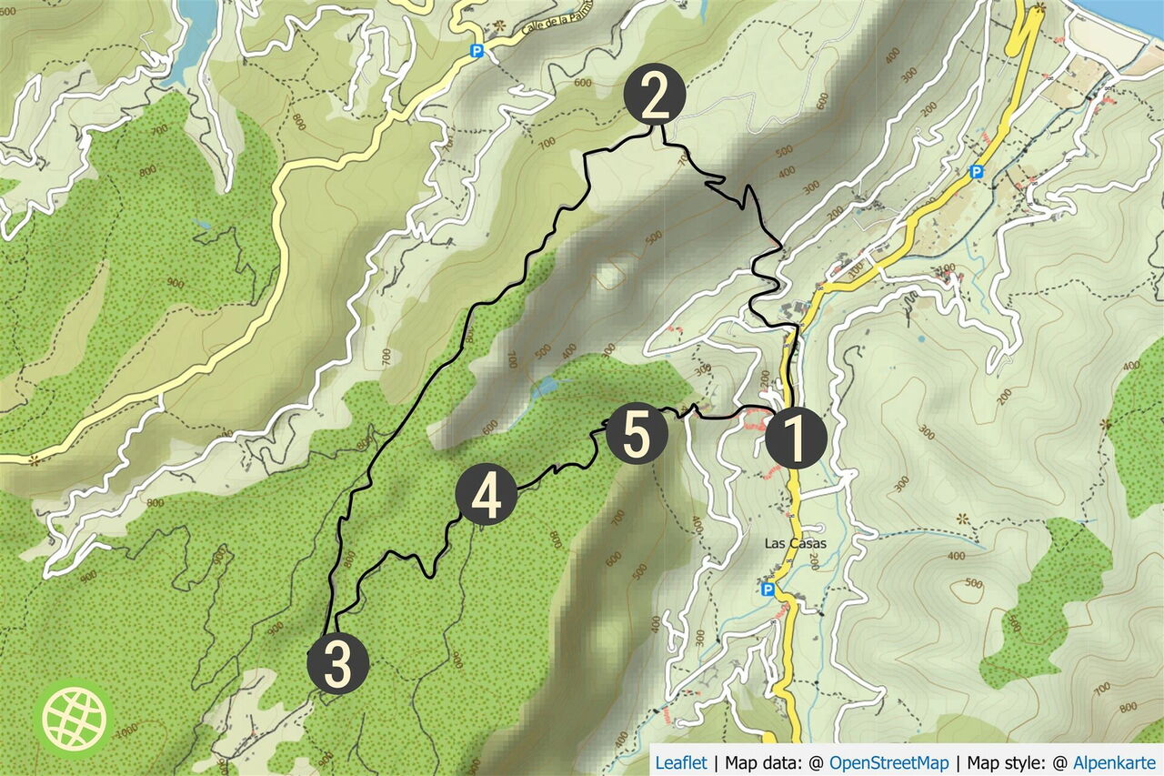 Vom (01) Ethnografischen Museum (150 m) gehen wir zunächst auf der GM-1 am Fußballplatz vorbei, um bei dem Zebrastreifen am Tourismuszentrum links bergauf Richtung Ibo-Alfaro abzubiegen. Nach 150 m gehen wir rechts in die Einbahnstraße und treffen anschließend auf eine Asphaltstraße, auf der wir 50 m rechts gehen, um dann die Straße nach links zu verlassen und den Treppenweg durch die Häuser zu nehmen. Vor dem Haus mit der Nummer 17 gehen wir links bergauf, bis der Weg endet und wir an der Asphaltstraße weitere 140 m rechts bis zu einem ockerbraunen Haus gehen. 35 m hinter diesem Haus beginnt links der Aufstieg: eine Rampe, 360 Höhenmeter fast senkrechter Aufstieg! An vielen Stellen werden die Hände zur Unterstützung gebraucht.