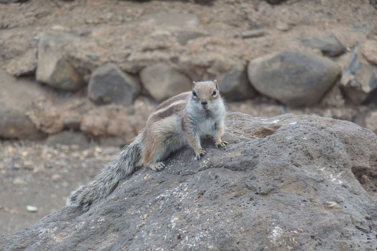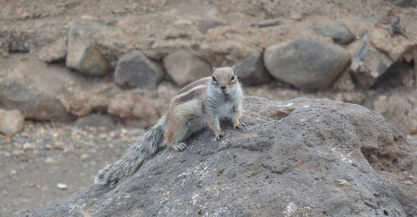 Nach Erkundung zweier riesiger vom Wind geformter Dünen wird der folgende Strandabschnitt schmaler und bei Flut gibt es kleinere Kletterstellen über Kieselsteine. An der einsamen Strandbucht des Playa El Salmo wird die Mündung des Barranco los Canarios gequert. Im weiteren Verlauf führt der Weg vorbei an Steinburgen bis zum nächsten Strand, dem Playa del Mal Nombre mit dem gleichnamigen Barranco. Dann sehen wir bereits aus der Ferne die vielen Sonnenschirmreihen des Playa de Esquinzo Butihondo, nahe der Urbanisation Esquinzo. Oberhalb der Klippen liegt das Hotel Paraiso Playa. 150 m hinter der Hotelanlage, direkt am Strand, sehen wir ein altes, verfallenes Gebäude. Wir gehen rechts zu einem Parkplatz, wo sich beinahe zahme (03) Atlashörnchen (14 m) angesiedelt haben.