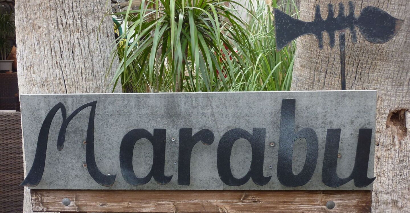Wir gehen wieder zum Strand zurück und nach weiteren 150 m führt ein Trampelpfad steil den Hang hinauf. Linker Hand befindet sich ein Restaurant, wir gehen aber bis zur Asphaltstraße vor, um dort links in die Einbahnstraße zu gehen und ihrem Verlauf zu folgen, bis sie endet. Nach weiteren 70 m befindet sich auf der rechten Seite das (04) Restaurant Marabu (55 m).