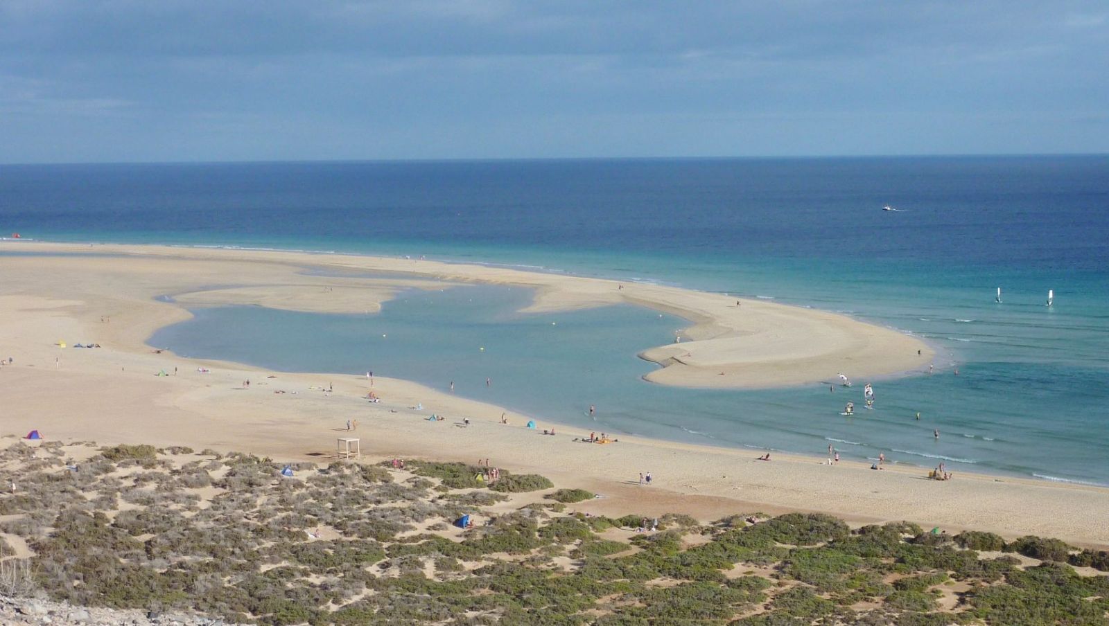 Bei Ebbe folgen wir dem dem Hotel Melia Gorriones vorgelagerten kleinen Damm in Längsrichtung zum Atlantischen Ozean. Nach 2,2 km Strandspaziergang entlang einer traumhaften Lagunenlandschaft können wir bereits auf der rechten Seite die Häuser und die wehenden Fahnen des Surfcenters bei der kleinen Streusiedlung von Risco del Paso ausmachen. Je nach Stand der Tide queren wir an dieser Stelle die Lagune Richtung (02) Playa Risco del Paso (1 m).