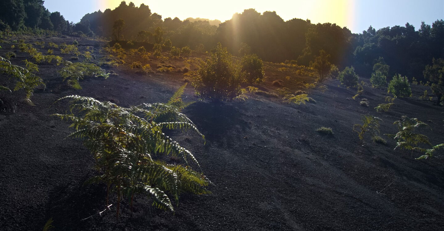 450 m hinter einem schwarzen Lapilli-Feld, das sich den Hang hinaufzieht – die Piste macht hier eine leichte Rechtskehre –, erreicht man weglos halb links über Vulkangestein einen wunderschönen Aussichtspunkt. Wir setzen unseren ursprünglichen Weg fort. Auf der Verbindungsstraße (03) HI-1 (1053 m) gehen wir 60 m links Richtung Frontera, um dann rechts auf die betonierte Piste zu biegen. Diese geht in eine Sandpiste über und bei der Weggabelung gehen wir halb rechts über die Absperrkette. Auf dem nachfolgenden Wegstück ist der Wald besonders dicht gewachsen und die Bäume sind sehr hoch – ihre Blätter bilden einen zweiten Himmel.