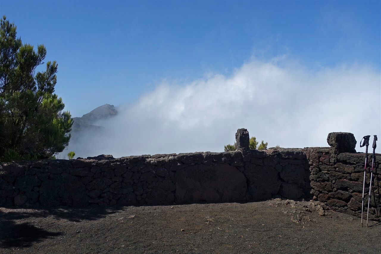 Gelegentlich treffen wir auf Überreste von Mauern, so auch bei einem Felsenvorsprung mit einem wunderschönen Ausblick. An dieser Stelle gehen wir nicht an dem Felsen vorbei, sondern noch vor dem Felsen und der Mauer halb rechts weiter bergauf. Parallel zum Pfad abgelegte Baumstämme und vereinzelte Steine helfen bei der Orientierung, bis wir zu einem Picknicktisch kommen. Sobald wir auf Lapilli-Untergrund laufen, sind es nur noch einige Meter, bis wir den Gratverlauf des zentralen Bergmassivs erreicht haben. Dort gehen wir sofort links auf einem Trampelpfad, aber auch zum Teil weglos, bis auf den Gipfel des (02) Fileba (1383 m). Rohe Emotionen steigen hoch, bei dem Panoramablick.