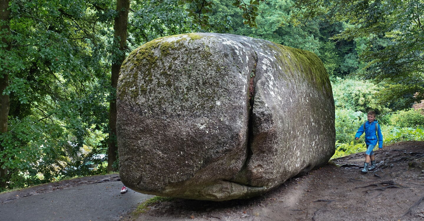 Vom Parkplatz – Start und Ziel der Wanderung – hinter der aus dem Jahr 1591 stammenden Église Saint-Yves de Huelgoat gehen wir bis zum Place Aristide Briand vor und dort rechts durch die Straße bis zum See. Hinter der Brücke befindet sich die alte Mühle Moulin du Chaos. Sie wurde 1339 erbaut und ist das älteste Gebäude in Huelgoat. Wir gehen bei der Crêperie rechts auf dem Pfad weiter. Zwischen den mit Moos bedeckten, riesigen Felsen hindurch erreichen wir die Grotte du Diable (Teufelsgrotte), bei der man über eine rutschige Eisentreppe in die Unterwelt absteigen kann. Auf dem weiterführenden Pfad geht es an mächtigen und rund geschliffenen Granitblöcken vorbei. Bei der ersten Weggabelung gehen wir dann halb links, überqueren den inzwischen unterirdisch verlaufenden Bachlauf und nehmen den ersten Treppenaufstieg, der an einer kleinen Höhle vorbeiführt. Über einen platt geschliffenen Felsen und in den Fels geschlagene Stufen gelangen wir zum 01 Roche Tremblante (164 m) herunter. Der sogenannte zitternde Felsen liegt auf einem schmalen Grat. Findet man den richtigen Druckpunkt in Kombination mit der richtigen Frequenz, so wird der 100 t schwere Granitblock in eine 2 bis 3 cm weite Schwingung versetzt! Bloß wo ist der Punkt?