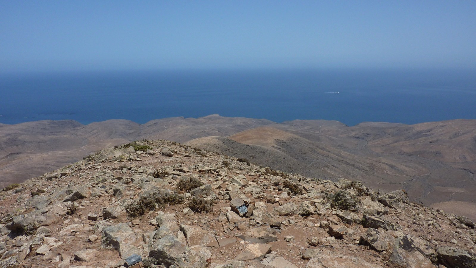 Als weitere Orientierungshilfe halten wir uns nun immer mittig auf dem Bergkamm, bis wir den Gipfel des (02) Hacha Grande (561 m) erklommen haben. Das Hacha-Grande-Gebirgsmassiv setzt sich aus 3 markanten Bergrücken zusammen, die aufeinander zulaufen. Über den Bergrücken aus südwestlicher Richtung sind wir aufgestiegen. In nördlicher Richtung führt ein Wanderweg nach Femès. In südöstlicher Richtung schlängelt sich ein Bergrücken bis an die Küste herunter.