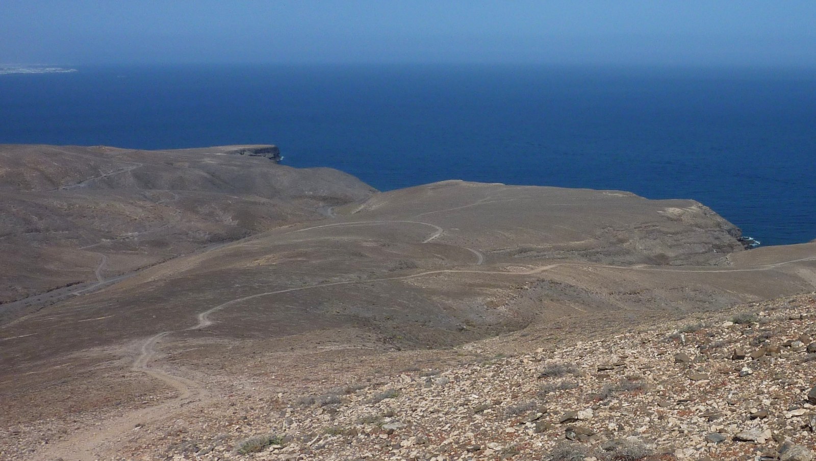 Nach einer Pause gehen wir im Barranco 330 m landeinwärts. Bei der ersten größeren Gabelung gehen wir im linken Barranco bergauf, um im weiteren Verlauf dann weglos zu einem (05) Schotterweg (70 m) aufzusteigen. Hier wandern wir rechts, lassen auf einer Anhöhe einen Abzweiger rechts liegen und steigen dann in das breite und sehr markante Barranco ab. Wir verlassen den Weg an dieser Stelle nach links und folgen immer dem Hauptstrom des Barrancos landeinwärts. Nach 1 km lassen wir das nach links abzweigende Barranco liegen. Als Orientierungspunkt dient uns nun der Hacha Grande, der halb rechts vor uns liegt. Das Barranco wird nun zunehmend schmaler. Die letzten 400 m gehen wir weglos bis zur Einsattelung, die wir ja schon vom Hinweg kennen. Der folgende Rückweg ist mit dem Hinweg identisch.
