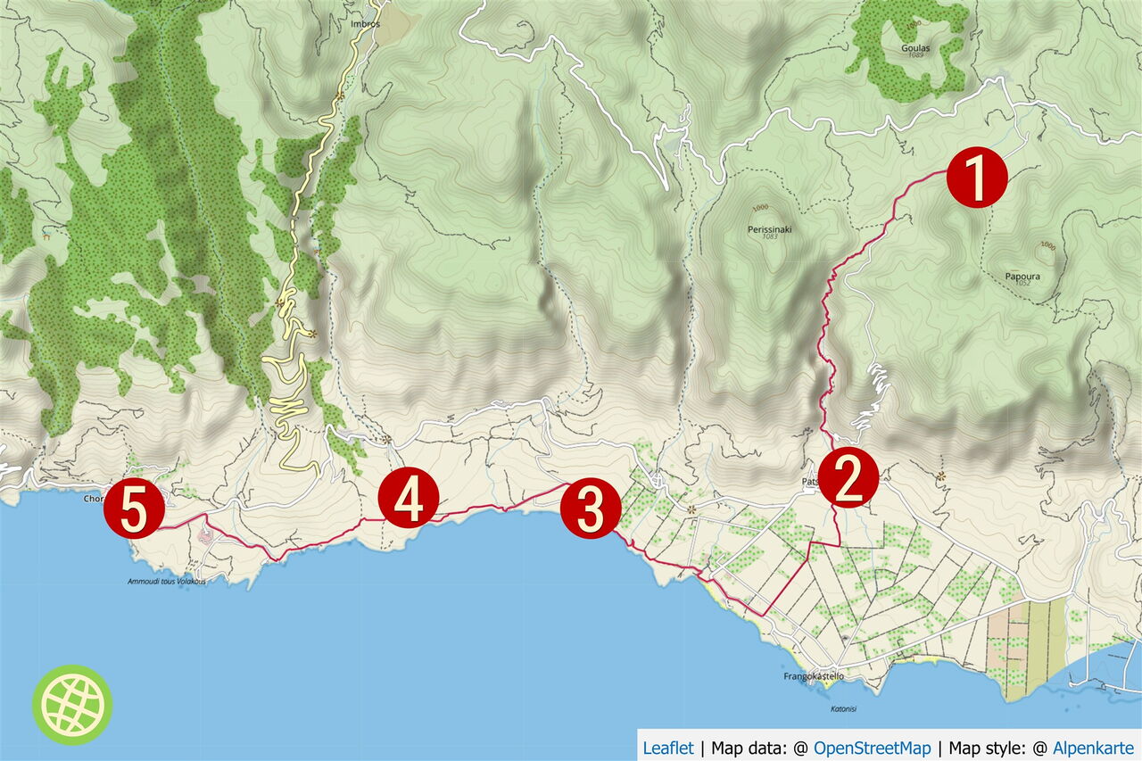 Die klassische Etappe dieses E4-Streckenabschnitts führt größtenteils entlang der Hauptstraße. Aus diesem Grund wurde sie komplett neu ausgelegt und führt nun entlang der Küste des Lybischen Meeres. Zur Tour: Nach der beeindruckenden Schluchtdurchwanderung folgt eine ebenso beeindruckende und faszinierende Küstenwanderung entlang von versteckten Traumstränden.