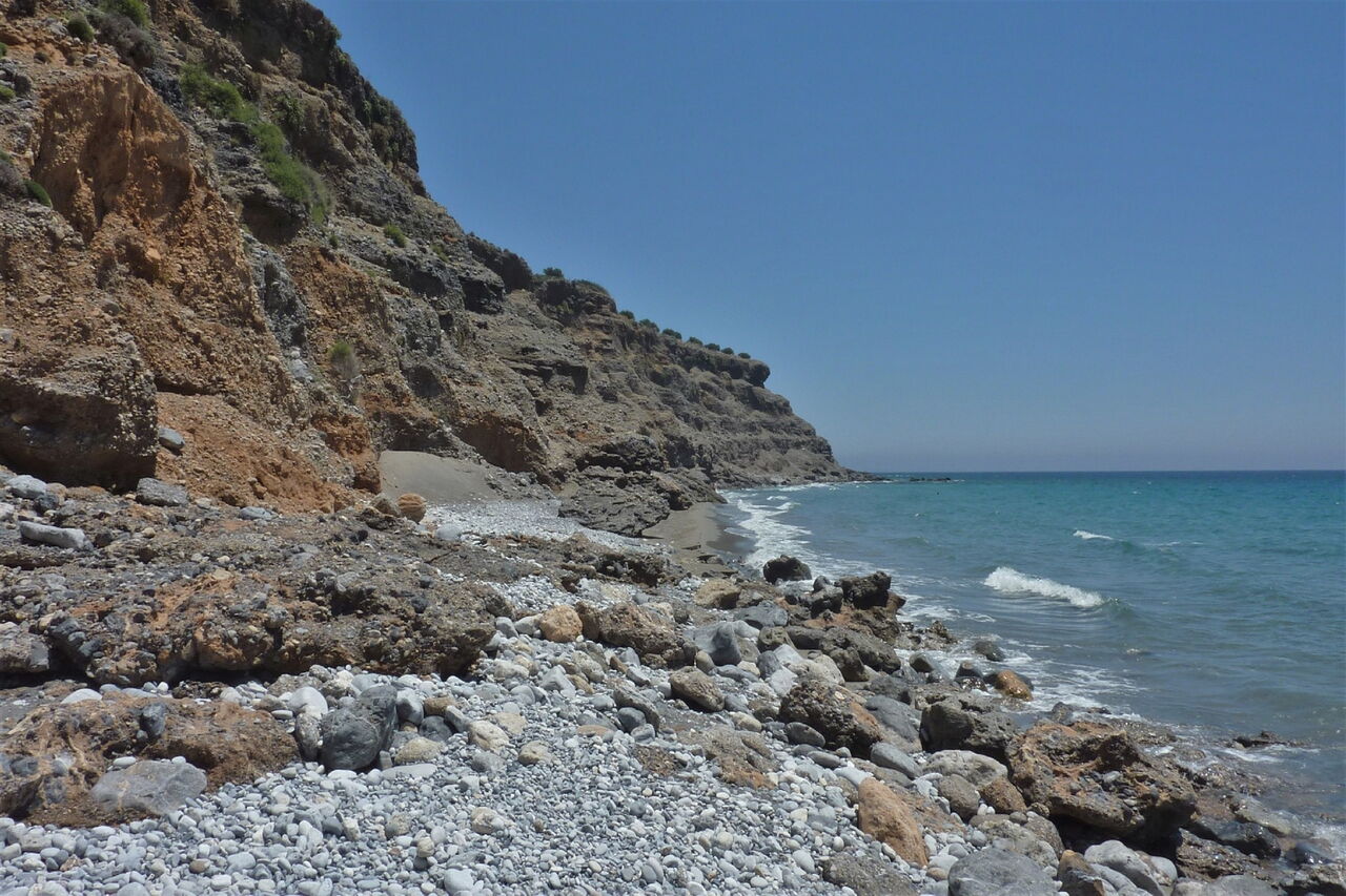 Auf der nachfolgenden Asphaltstraße gehen wir bis zum Koutelos-Strand. Hier gehen wir oberhalb des Hafenbeckens rechts die Schotterpiste bergauf, um dann vor den rotbraunen Felsen weiter aufzusteigen und durch das Ziegengatter auf die Klippen zu gelangen. Der Pfad geht in eine Piste über. Nach 600 m, bei einem Steinmännchen, gehen wir 10 m halb links bis an den schwindelerregenden Klippenrand. Abermals versperrt eine Schlucht das Weiterkommen und es folgen 04 2 weitere Schlüsselstellen (50 m). Wir gehen zunächst landeinwärts, dann bei einer Ziegenhaltung in die Schlucht hinein und schließlich weitere 170 m landeinwärts, bis wir bei Steinmännchen leicht über Felsen aus der Schlucht steigen können. Wir folgen der Piste, die parallel zum Meer verläuft, bis sie endet. Dort gehen wir 170 m links, um dann bei dem Steinmännchen rechts in wegloses Gelände zu gelangen. Zwei weitere Steinmännchen folgen und wir gehen fast parallel zu 5-10 m hohen Felsen, die sich rechts von uns befinden. Wir treffen auf die Schlucht, die wir an dieser Stelle unproblematisch queren können.