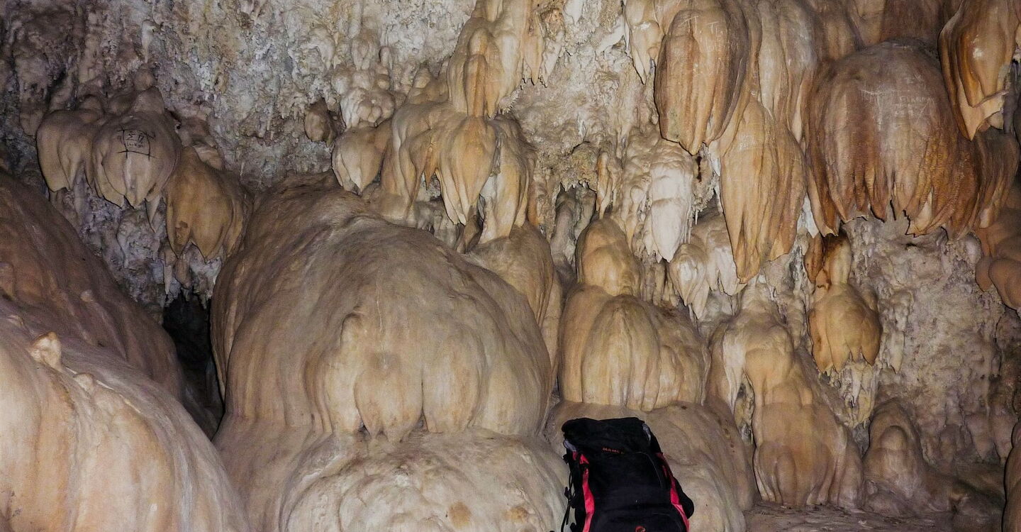 Wir überqueren den Bachlauf und gehen auf dem Trampelpfad oberhalb des Bachlaufs, bis wir auf eine große Gumpe treffen. An dieser Stelle klettern wir im Bachbett bergab, bis wir auf der linken Seite die (03) Tropfsteinhöhle (123 m) sehen. Nach Regenphasen sind die Felsen extrem rutschig.