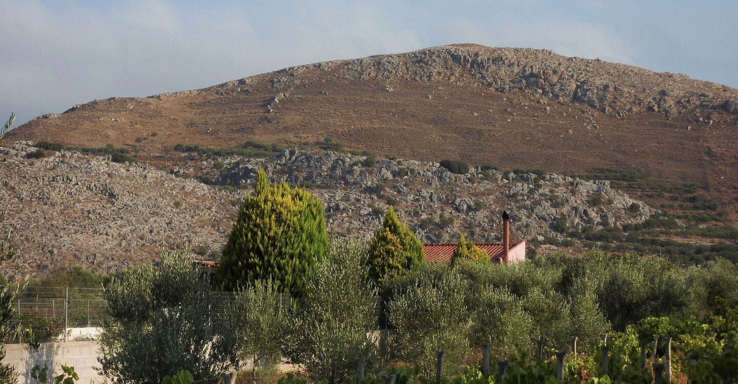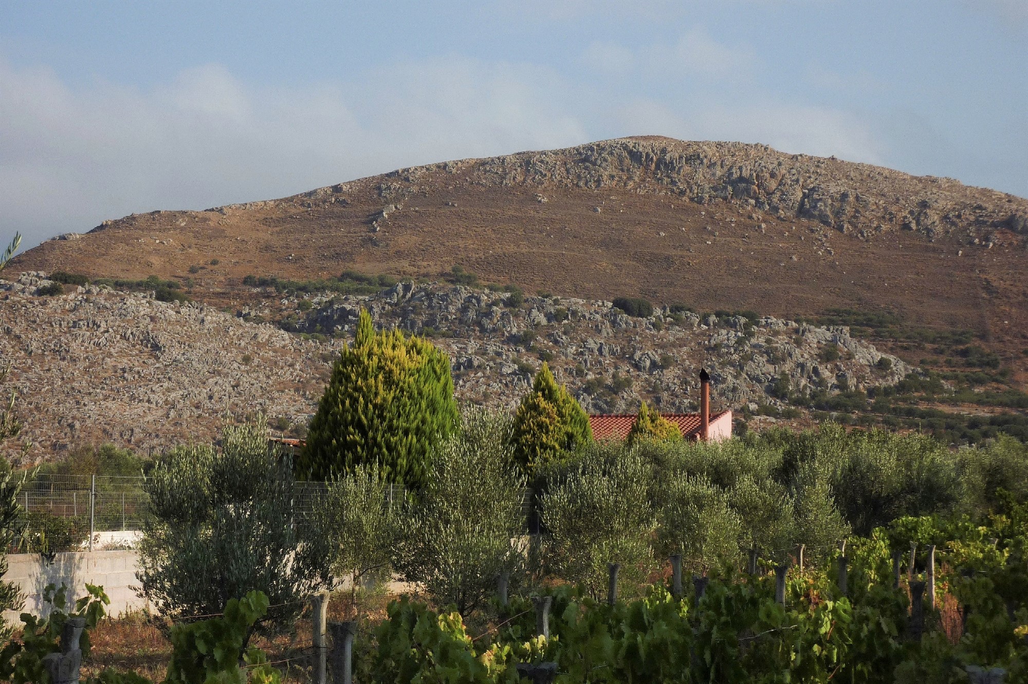 Diese lassen wir links liegen und gehen auf dem weiterführenden Weg in westliche Richtung, den rechten Abzweiger ignorieren wir. In der Ferne können wir bereits das 02 Agarathos-Kloster (367 m) ausmachen, eines der ältesten Klöster auf Kreta. Wir gehen auf der bergab führenden Asphaltstraße, bis sie endet. Anschließend gehen wir nur 190 m links Richtung Kastelli, um dann halb rechts parallel zu den Weinstöcken zu wandern. Am Ende dieser gehen wir nun weglos durch die Olivenbäume bergab, halten uns dabei so weit wie möglich links und erreichen so die linke Ecke im Olivenhain. Ein Stock und 2 Steine markieren eine Stelle, wo man den Zaun übersteigen kann.