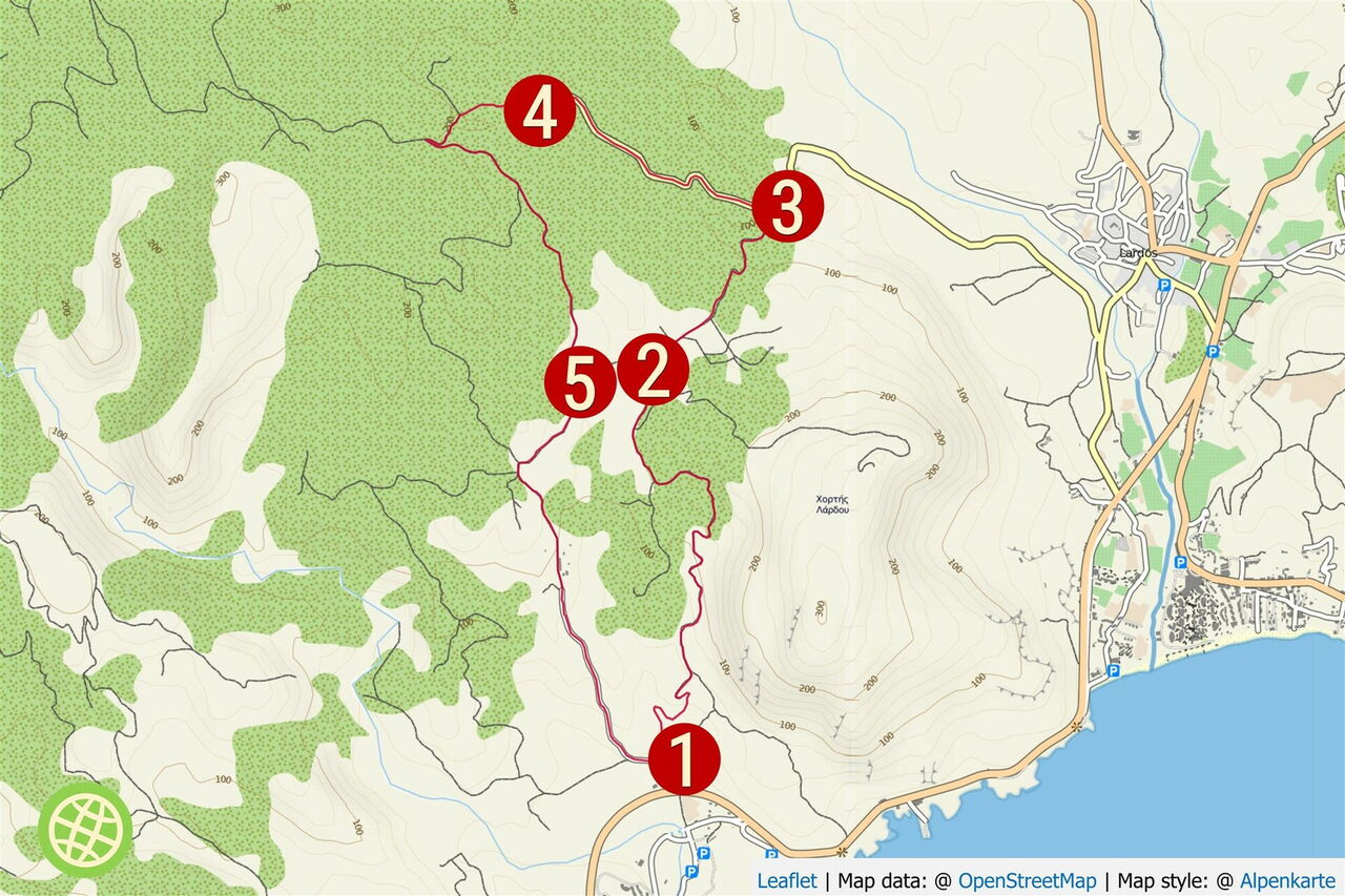 Buslinie KTEL: Rhodes – Kiotari – Gennadi, wochentags 6 tägliche Verbindungen. Entfernung Rhodos Stadt: 57 km. Mit dem Pkw fahren wir auf der südwestlichen Küstenstraße Richtung Gennadi. 350 m nach dem linken Abzweiger zum Hotel Lindian Village biegen wir rechts in die Asphaltstraße ab und parken hier den Pkw. Geokoordinaten: 36.070733 27.990083.