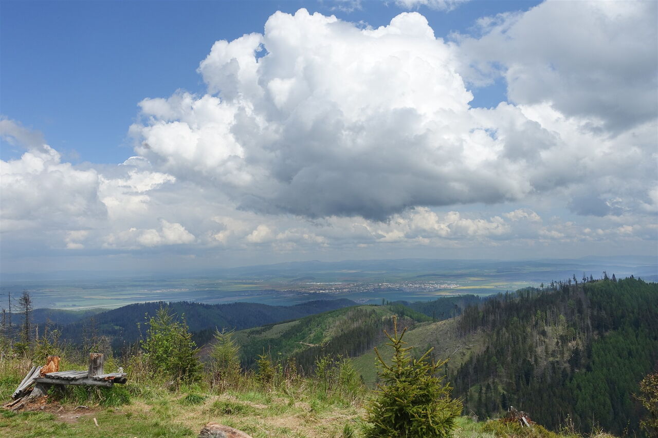 Leicht bergab traversieren wir über einen Berghang bis zu einem rechten Abzweiger und folgen dort dem blau ausgewiesenen Pfad. Bei der nachfolgenden Einsattelung orientieren wir uns an der Weggabelung halb links und erreichen schlussendlich den Gipfel des 04 Kozí kameň (1255 m). Richtung Norden schaut man auf die Westliche und die Hohe Tatra, Richtung Nordosten erkennt man die Stadt Poprad und Richtung Süden sieht man die östliche Region der Niederen Tatra. Wir überschreiten den Gipfel und marschieren nun auf dem weiterführenden Pfad bergab.