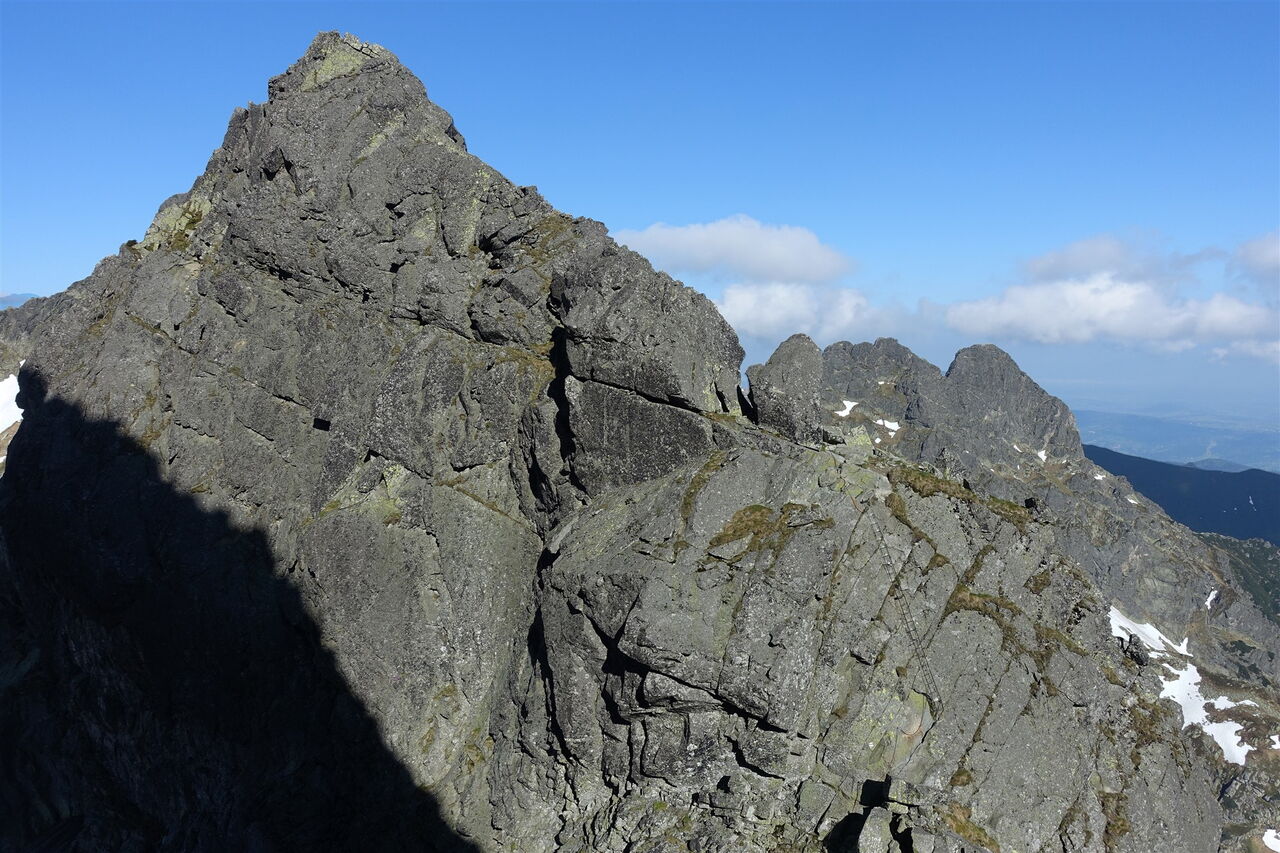 Notabstieg: Hinter der Einsattelung Przełączka nad Dolinką Buczynową führt links ein schwarzer Abstieg zur Hütte Schronisko PTTK Murowaniec. Nach 25 Minuten führt links ein grüner Steig bergab, auch dieser führt zur Hütte Schronisko PTTK Murowaniec. Weiter auf dem Höhenweg: Es erfolgt ein längerer Abstieg unterhalb des nördlichen Bergkamms, um dann rechts steil durch einen spektakulären Kamin aufzusteigen, den Komin pod Czarnym Mniszkiem. Wir erreichen den markanten Gipfel des 04 Skrajny Granat (2225 m). Hier beginnt dann ein luftiges Kletterabenteuer mit vielen ausgesetzten Passagen, Kettensicherungen und Eisenleitern. Der Klettersteig ist vorgegeben und bedarf keiner weiteren Erklärung. In den schattigen Lagen liegt noch bis Mitte Juni Schnee!
