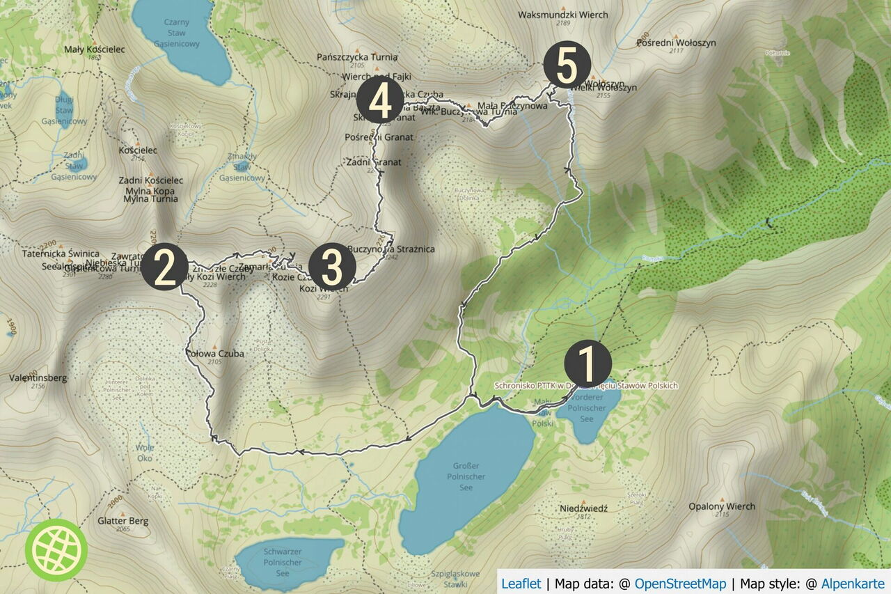 Von der 01 Fünf-Polnische-Seen-Hütte (1670 m) gehen wir in nordwestlicher Richtung auf dem blau markierten Wanderweg durch das Dolina Pięciu Stawów Polskich. Wir queren den Abfluss des Sees Wielki Staw Poliski und ignorieren die nachfolgenden drei Abzweiger (gelb, schwarz, gelb markiert), allesamt führen auf den Orla-Perć-Höhenweg.