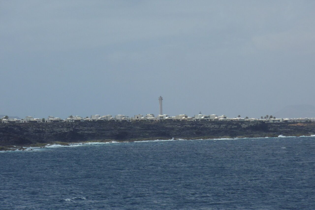 Ab und zu markieren rostige Pfeiler den Weg. Hinter der Punta Guinéa dreht die Richtung des Weges auf Süd. Links liegt nun der Hausvulkan von Playa Blanca, der Montaña Roja, und am Horizont lassen sich bereits der Leuchtturm sowie die vorgelagerten Apartmentanlagen ausmachen. Nach einem Graben gehen wir direkt auf die ersten Häuser zu, um noch weitere 200 m auf der Strandpromenade zu spazieren. Dann biegen wir bei einem Grünstreifen links in die nur kurz später beginnende Calle Irlanda ab, gehen vorbei an einigen Läden und erreichen die (05) Bushaltestelle Faro Park (19 m).