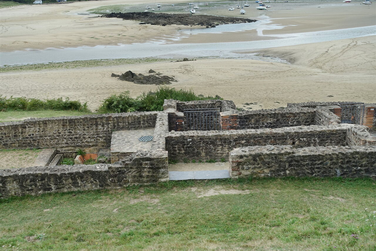 Sobald die Straße zum Strand herunterführt, zweigen wir halb links auf den Pfad durch den Kiefernwald ab. Erhöht von den Klippen aus schaut man auf das Grève des Curés mit der dahinter liegenden Bucht Locquirec. Sobald wir parallel zur Straße gehen, treffen wir auf erstaunlich gut erhaltene gallo-römische Thermen, die 05 Thermes Gallo Romains du Hogolo (16 m). Sie stammen aus dem Jahre 50 n. Chr., sind 1992 restauriert worden und seitdem für die Öffentlichkeit zugänglich. Wir gehen auf dem Küstenpfad weiter und erreichen den Ausgangspunkt.