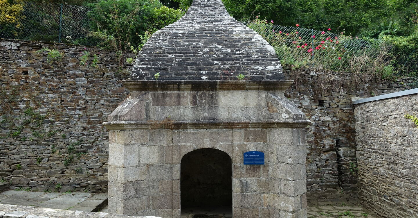 Dort gehen wir geradeaus weiter bis zur Hauptstraße, überqueren diese am Zebrastreifen und gehen am Herrenhaus Manoir de Kérallic vorbei. Im weiteren Verlauf passieren wir eine Steinmauer bei einem Durchbruch, um in einem Rechtsbogen um das Herrenhaus herumzugehen und dem Wegweiser Richtung Plage zu folgen – links unterhalb sieht man den Plage La Lieue de Gréve. Nach einem kurzen Stück im Wald folgt eine 180°-Kehre und in engen Kehren geht es auf einem Pfad bis zur Straße, an der wir rechts und nach weiteren 30 m abermals rechts gehen. Dort befindet sich der aus dem 16. Jahrhundert stammende Granitbrunnen 02 Fontaine Saint Efflam (16 m). Nur wenige Meter oberhalb des Brunnens liegt die aus dem 15. bis 18. Jahrhundert stammende Kapelle Saint Efflam.