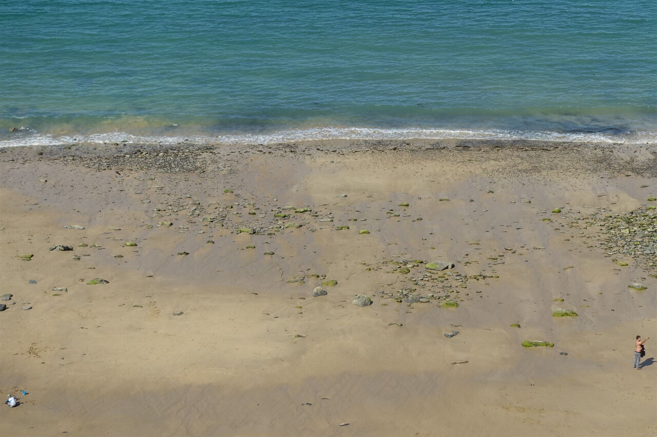 Auf der Straße gehen wir ein kurzes Stück des Hinwegs zurück und dann weiter geradeaus bis zum Ende der Straße – hier befindet sich ein riesiger Feigenbaum unter einer mächtigen Pinie. Wir gehen links an der Mauer entlang und folgen dem Zöllnerpfad. Dieser mündet in die Kehre einer Straße. Wir gehen halb rechts und in der nachfolgenden scharfen Rechtskurve der Straße gehen wir geradeaus auf dem GR34 weiter. Bei einer Hafenmole erreichen wir das nördliche Ende der Halbinsel, rechts befinden sich die große Bucht 03 La Lieue de Gréve (13 m) und ein kleiner windgeschützter Hafen, links der Plage de Beg Douar.