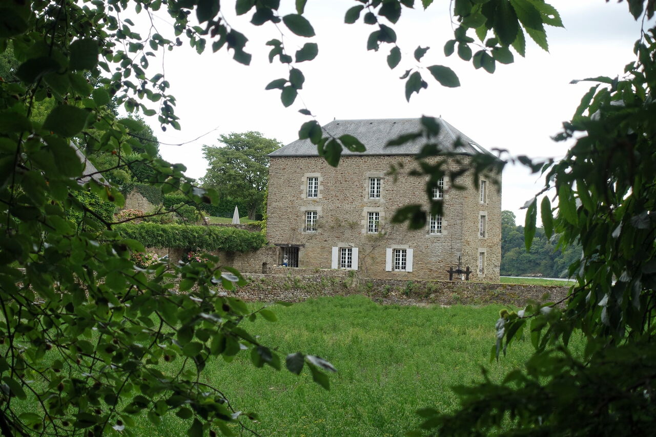 Wir überqueren eine Straße und gehen dort geradeaus an einer Reithalle vorbei. Der Weg mündet in eine rechts abzweigende Grundstückseinfahrt und wir gehen direkt auf ein Haus zu, bei dem wir rechts auf dem weiterführenden Pfad weiterwandern. Im Waldstück erreichen wir eine Weggabelung, rechts befindet ein grünes Gatter. Hier gehen wir rechts leicht bergauf an einem Zaun entlang. Ein rechter Abzweiger wird ignoriert. An der nachfolgenden Weggabelung – von dort kann man eine Hochbrücke ausmachen – gehen wir rechts, bis der Pfad endet. Dort gehen wir dann nicht links, sondern rechts bergauf und nun direkt über das private Anwesen des 02 Le Château de Péhou (30 m). Der Durchgang ist nicht verboten! Der Wanderweg wird durch Ketten begrenzt, Verbotsschilder nach rechts und links weisen auf das Privatgrundstück hin. Wir gelangen an einen Aussichtspunkt, von dem man das Schloss an der Flussmündung der Rance ausmachen kann.
