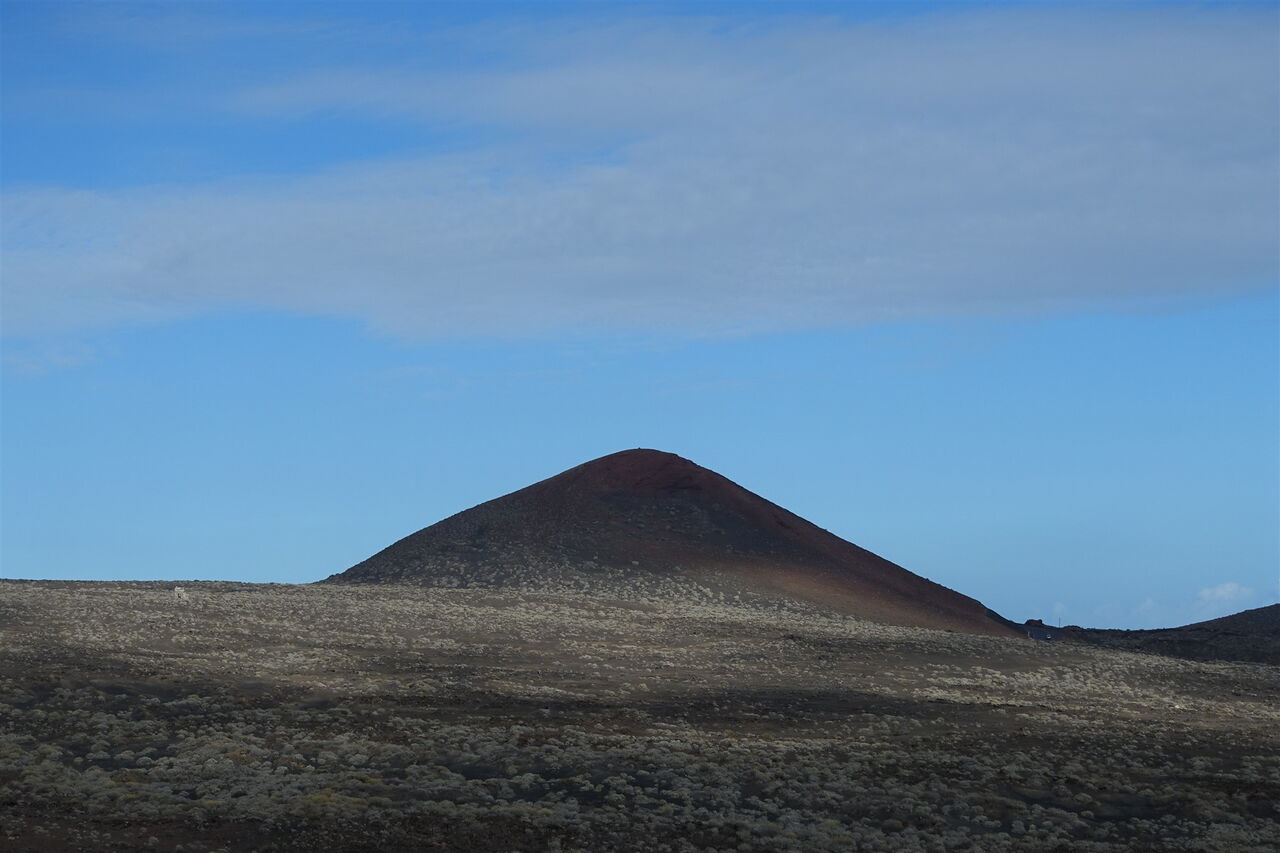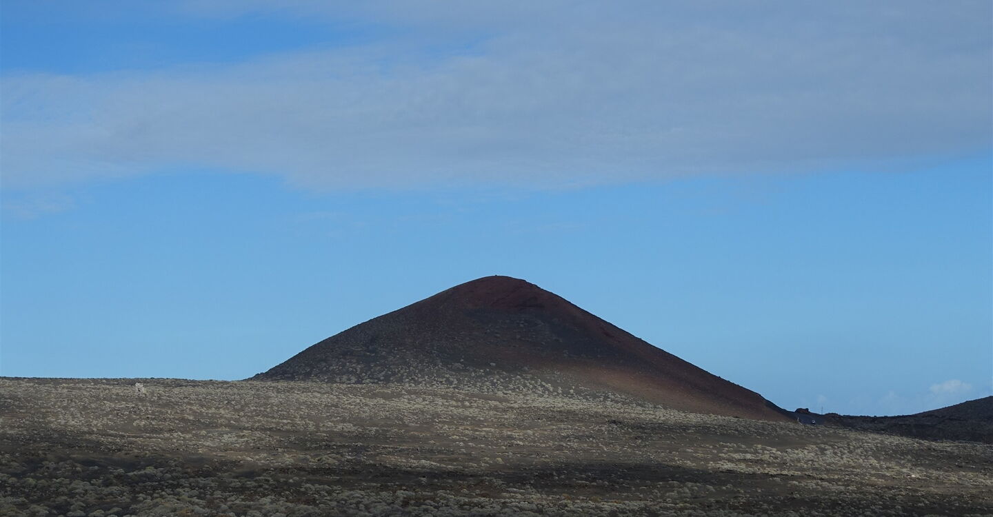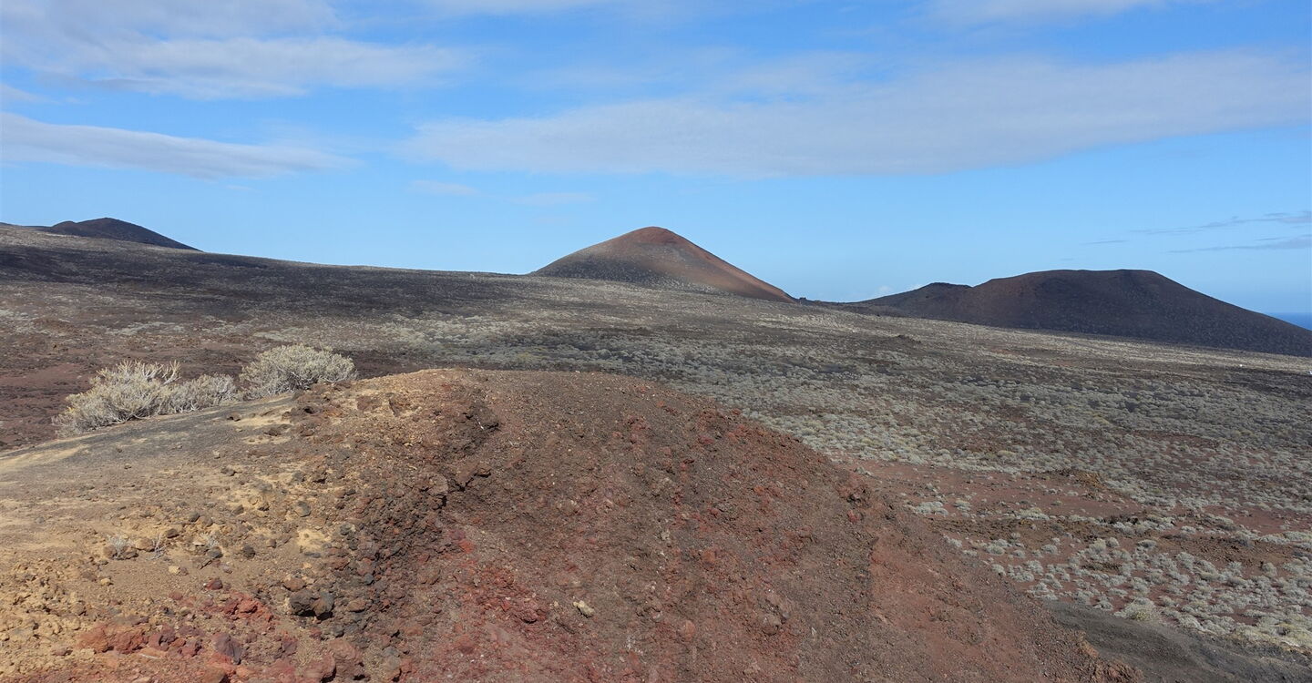 Wir gehen bis zur Straße (04) HI-4 (173 m) herunter und folgen dieser Richtung El Pinar, bis wir kurz hinter der Einsattelung auf eine kleine Betonsäule treffen, auf der die Nummer 12 geschrieben ist. Hier verlassen wir die Straße nach rechts und wandern zunächst durch die Senke bergab. Weglos und abschnittsweise auf Ziegenpfaden gehen wir direkt auf die Flanke des vor uns liegenden Vulkans zu. Weiter geht es parallel zu einer Trockensteinmauer, bis wir einen Mauerdurchbruch durchschreiten.