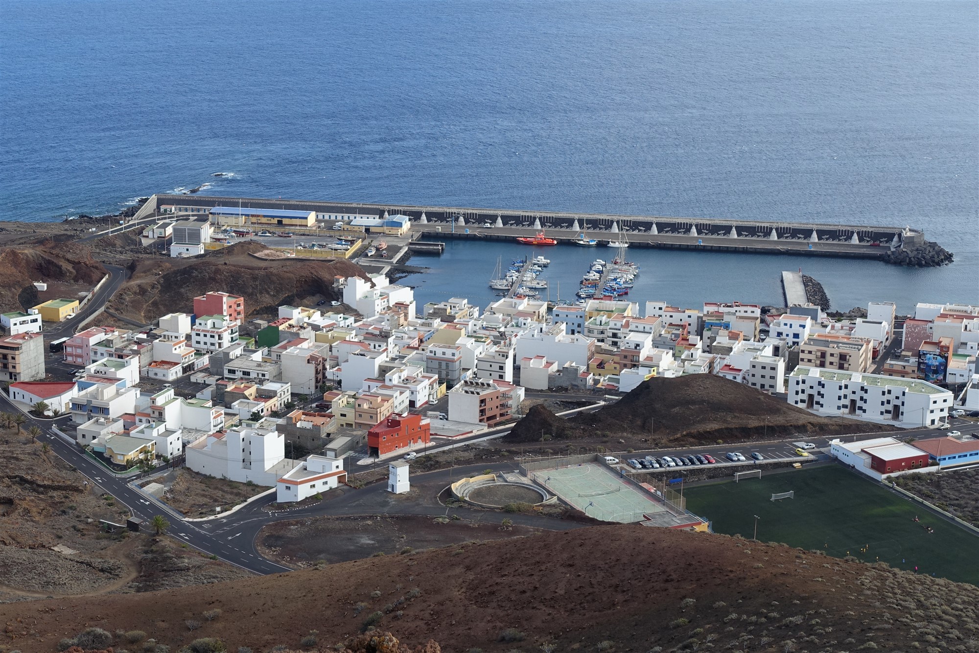 Von nun steigen wir auf Ziegenpfaden auf dem halb rechts von uns liegenden Bergrücken bis zum Gipfel der (05) Montana Restinga (209 m) auf. Dabei kann es sehr windig werden, denn die Passatwinde treffen ungebremst auf die ersten Hügelketten von El Hierro. Am Gipfel angekommen, schauen wir aus der Vogelperspektive auf das kleine Fischerdorf La Restinga. Zum Abstieg gehen wir weitere 70 m halb links auf dem Vulkankrater, um uns dann auf einem nicht so steilen, aber trotzdem gerölligen und rutschigen Untergrund in Richtung des rotbraunen Gebäudes zu orientieren, welches sich halb links unterhalb befindet. Kurz unterhalb des Gebäudes steht ein Strommast, bei dem wir auf einen Pfad Richtung La Restinga treffen. Dieser führt an der Bushaltestelle vorbei und auf einer der Straßen geht es bis zum Hafengelände herunter.