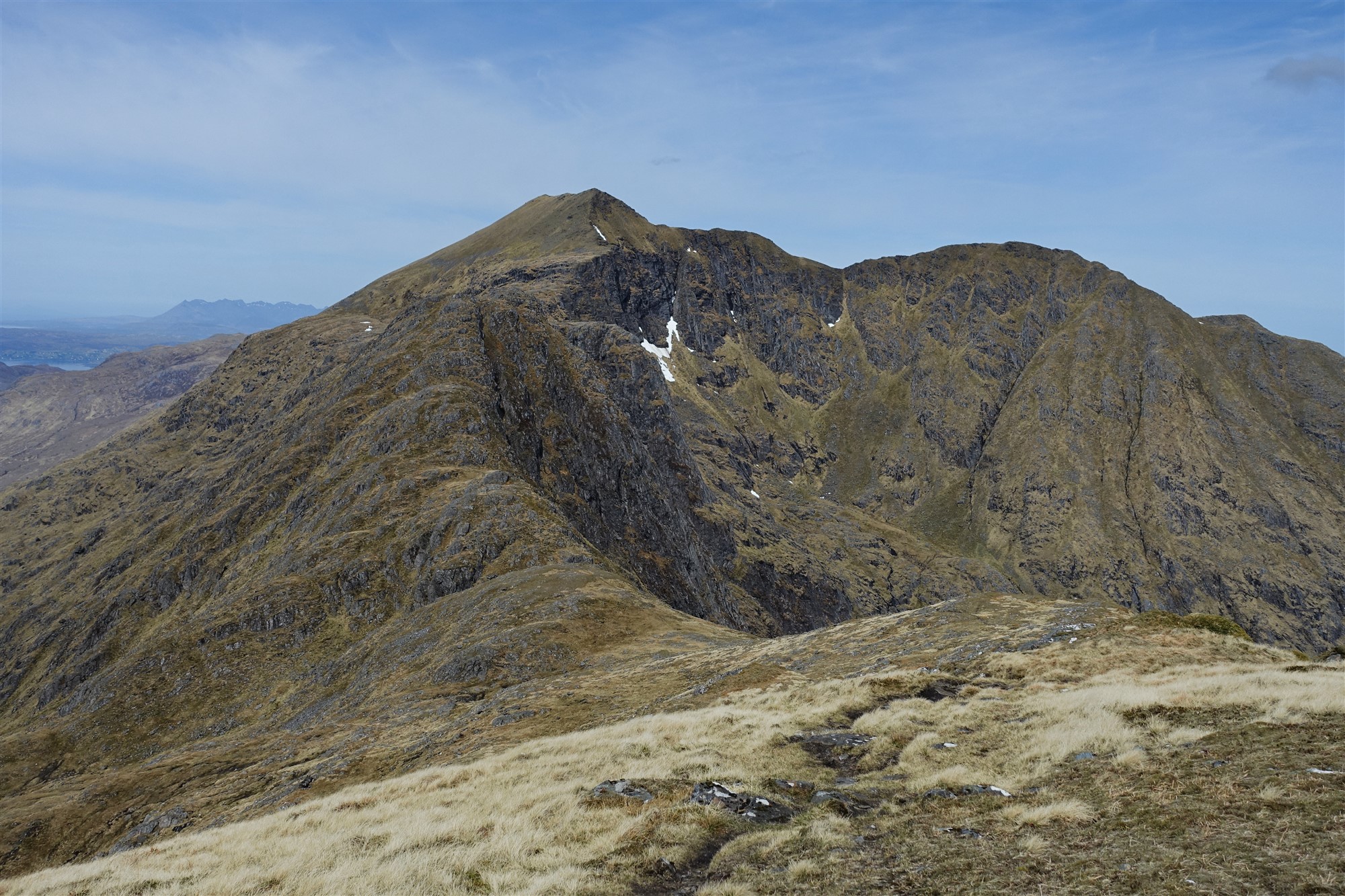 Über einen steilen Abstieg zu der Einsattelung Coire Dhorrcail folgen wir dem Pfad in nordwestliche Richtung. Danach folgt ein steiler Aufstieg, gelegentlich müssen die Hände zu Hilfe genommen werden und es gibt eine Kletterstelle mit dem Schwierigkeitsgrad 2. Hat der Ladhar Bheinn auf seiner südwestlichen Ausrichtung grasbewachsene Hänge, so tut sich unter seinem Gipfelgrat eine steile und zerklüftete Felswand, der sogenannten Coire Dhorrcail auf. Ein nun klar definierter Pfad führt zu dem größtenteils grasbewachsenen Grat hinauf und zum Gipfel des 04 Ladhar Bheinn (1020 m). Es gibt sensationelle Ausblicke entlang des Berggrats bis zu einem Trigonalpunkt, über die Weite des Meeres, zu den Cuillins auf der Insel Skye und rechts hinunter zur Barrisdale Bay und zum Loch Hourn.