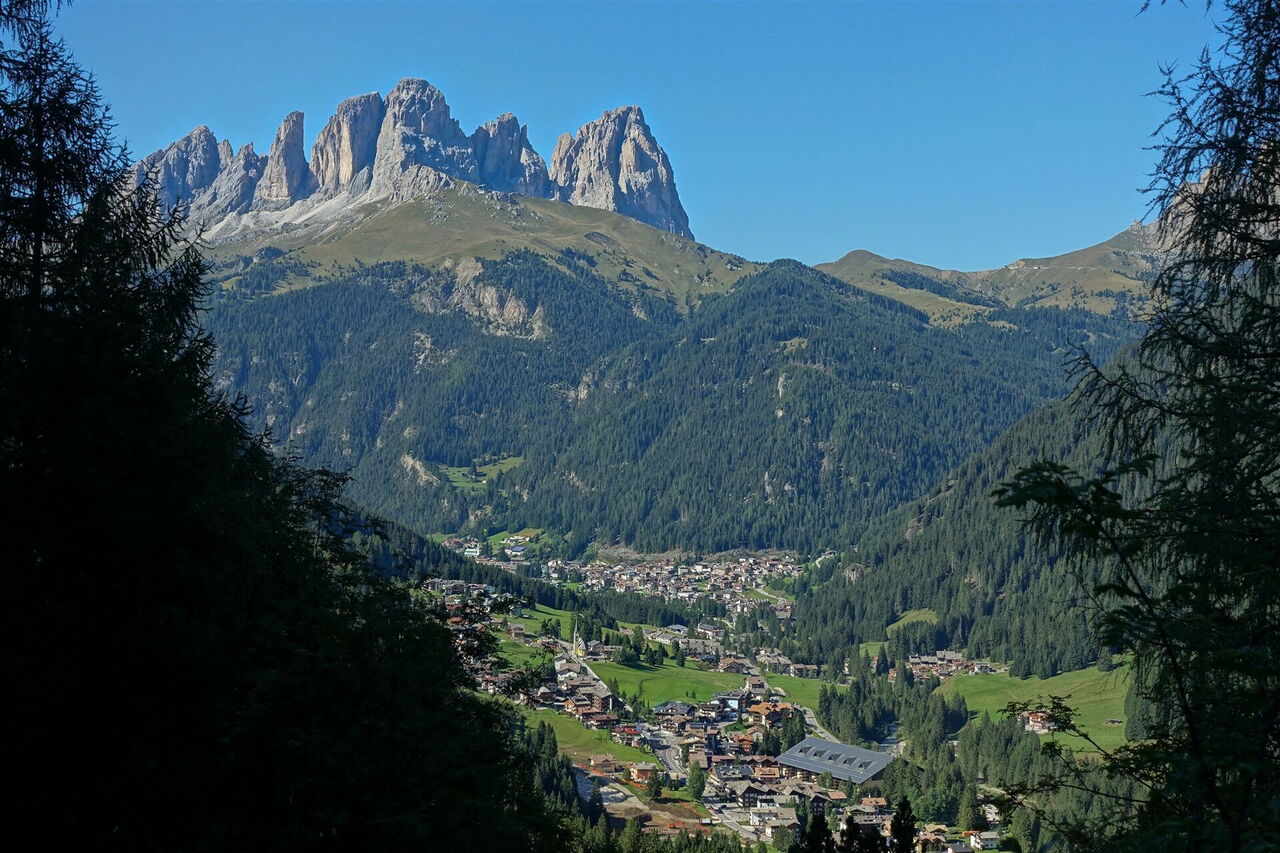 Dort, wo sich der Sentiero in drei Äste aufteilt, gehen wir ganz rechts, nun steil bergauf. Nach einem längeren Aufstieg erreichen wir ein Bachdelta mit einer kleinen Staustufe. Hier gehen wir scharf rechts, überqueren den 04 Bachlauf (1.684 m) und erreichen die von rechts kommende Forststraße aus Alba di Canazei, zugleich der Wanderweg 602.