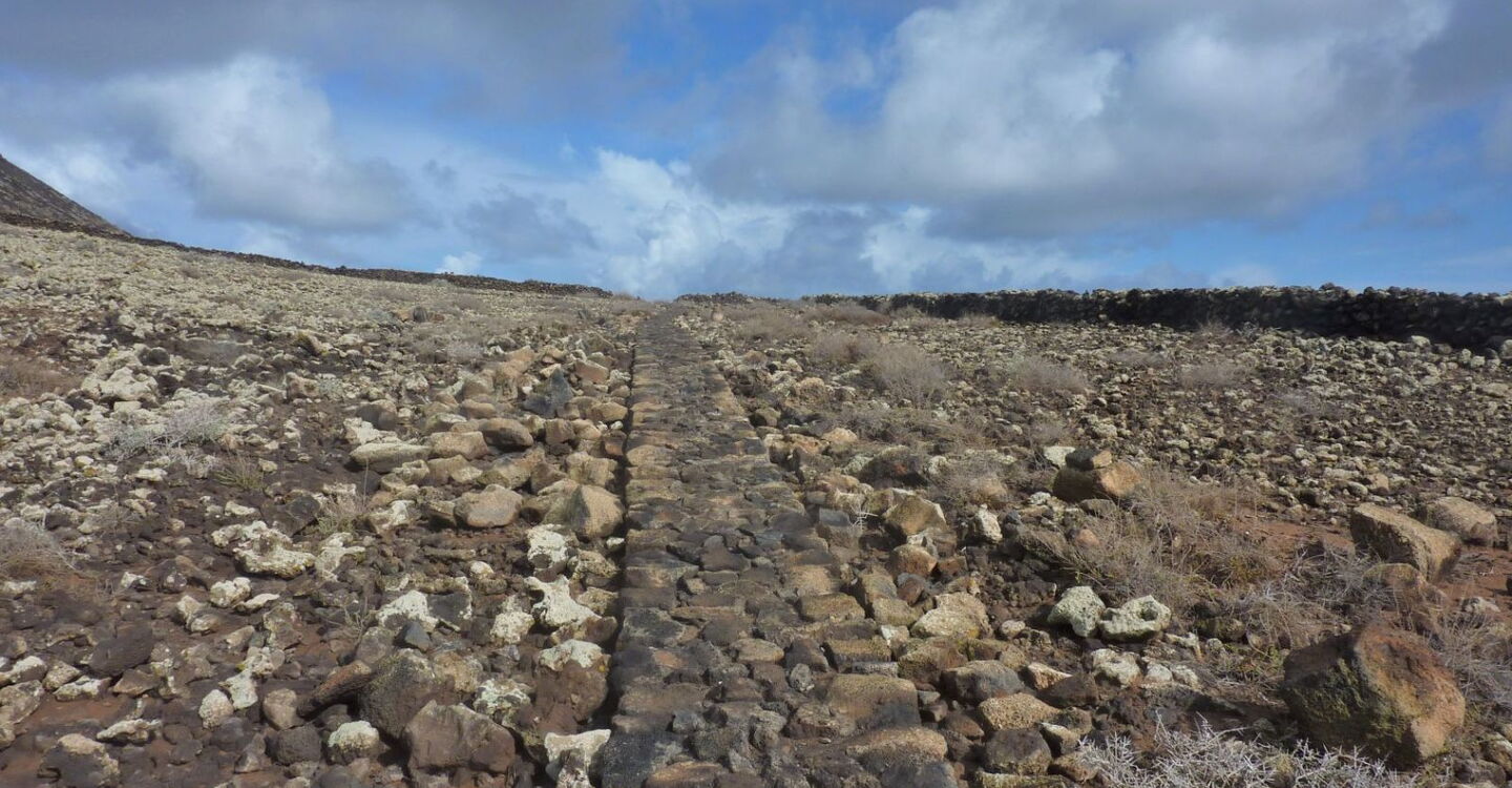In östliche Richtung führt ein Pfad weg vom vereinzelt stehenden Gebäude, vorbei an brachliegenden Feldern, zu einem markanten aufrecht stehenden Felsen, den man schon aus der Ferne ausmachen kann. Wenn wir an diesem Stein auf der Schotterpiste links gehen, gelangen wir nach Corralejo. Wir gehen aber rechts in (04) Richtung Lajares (189 m). Nach 1,2 km auf der Schotterpiste gehen wir bei der folgenden Weggabelung erneut rechts. Nach weiteren 700 m verlassen wir den Hauptweg und gehen nun halb rechts auf dem Nebenweg weiter.