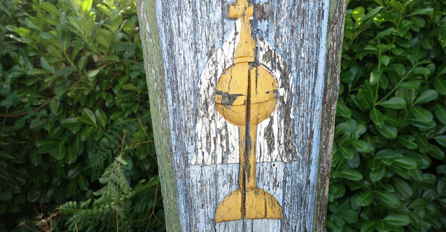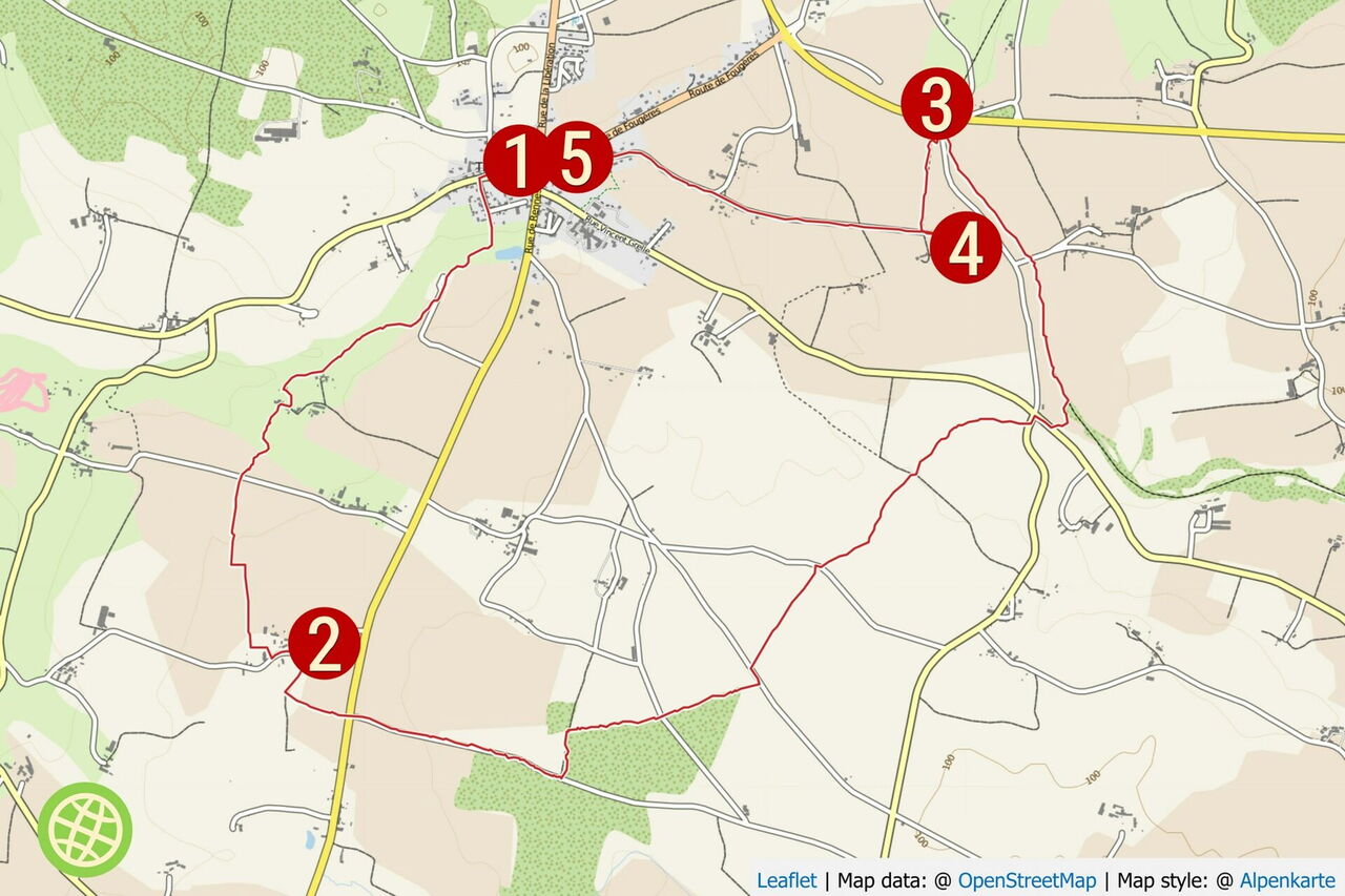 Dort, wo der Weg endet, gehen wir ein kurzes Stück links auf der Asphaltstraße. Sobald auch diese Straße endet, gehen wir rechts und bei der nächsten Möglichkeit wieder links – hier befindet sich ein Haus mit rotem Gartentor. Es folgt ein wunderschöner Hohlweg, bis es dann nach einer Straße, die wir überqueren, über Felder weitergeht. Hinter einer Linkskehre, gefolgt von einer Rechtskehre, ist die Wegführung nicht eindeutig; hier gehen wir direkt auf Häuser zu. Bei einem mit Efeu zugewachsenen Haus endet der Pfad. Hier gehen wir links und an der nachfolgenden Straße bis zur Hauptstraße vor, an der wir dann links gehen. Nach 200 m erreichen wir das 02 La Croix de la Dieuverrie (73 m), eines der seltenen gut erhaltenen Holzkreuze im Département. Beachten Sie von oben nach unten eine Dornenkrone, eine Monstranz, einen Kelch sowie 31 Münzen als Symbol des Verrats des Judas.