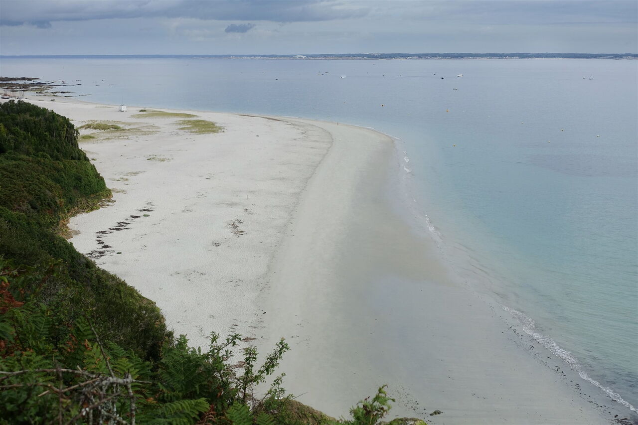 Abzweiger zu diesen schönen Buchten ignorieren wir genauso wie einen rechten Abzweiger zu einem Campingplatz. Wir biegen stattdessen links in die Piste mit dem Einfahrtverbotsschild ein und erreichen einen Megalithen. Anschließend kommen wir zu dem Höhepunkt der heutigen Wanderung, dem konvex ins Meer gewölbten Strand 02 Les Grands Sables (4 m) mit feinem weißen Sand und glasklarem türkisfarbenen Wasser. Aufgrund der vorherrschenden Meeresströmungen, die mal stärker aus Nordwest und mal stärker aus Südwest kommen, ändert sich sein Erscheinungsbild ständig. Ein Strand im Wandel der Gezeiten, ein besonderes Kuriosum. Am Ende des Strandes steigen wir über Treppen hinauf zum weiterführenden Wanderweg.