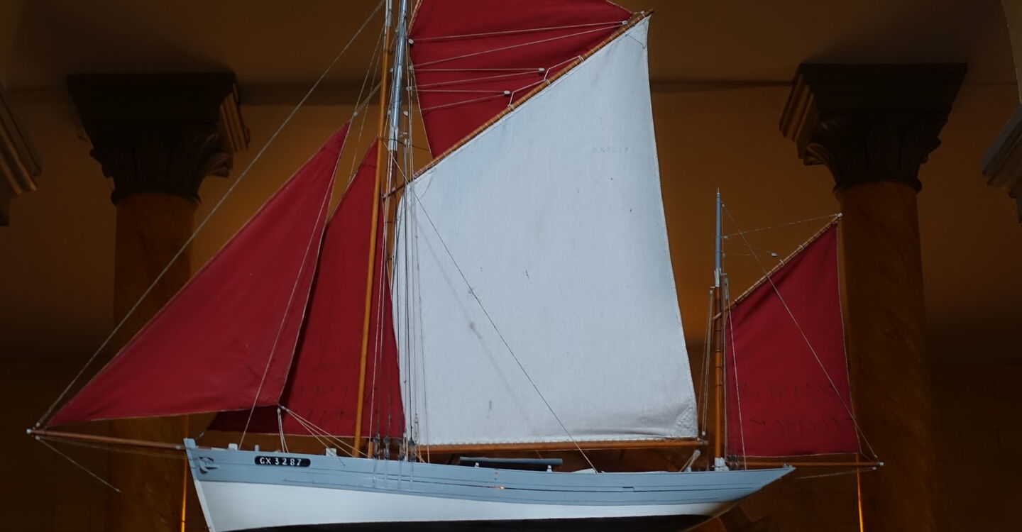 Kurz hinter einem Teich und einer Quelle gehen wir auf der nachfolgenden Straße links, um hinter dem Haus mit den roten Rollläden halb rechts auf die Piste abzuzweigen. Hinter dem Klettergarten endet die Piste und wir gehen links auf der Straße bis zur nächsten Kreuzung nach 250 m vor. Hier gehen wir rechts und erreichen die Inselhauptstadt. Durch die Fußgängerzone gehen wir direkt auf die 05 Église Saint Tudy (27 m) zu. Anstatt eines Wetterhahns ziert ein Thunfisch die Spitze des Glockenturms. Er erinnert an die Zeit Anfang des 20. Jahrhunderts, als die Insel der führende Thunfischhafen Frankreichs war. Wir verlassen den Kirchplatz in nördliche Richtung auf der Rue de St. Albin, kommen an einer Lagerhalle vorbei, gehen ein kurzes Stück neben einem Bachlauf her und biegen vor weiteren Lagerhallen links und dann sofort wieder rechts ab. Auf der nachfolgenden Straße gehen wir gerade durch ein kleines Industriegebiet. Dort, wo es links in die Sackgasse geht, gehen wir geradeaus weiter und erreichen einen schönen Aussichtspunkt oberhalb des Hafens.