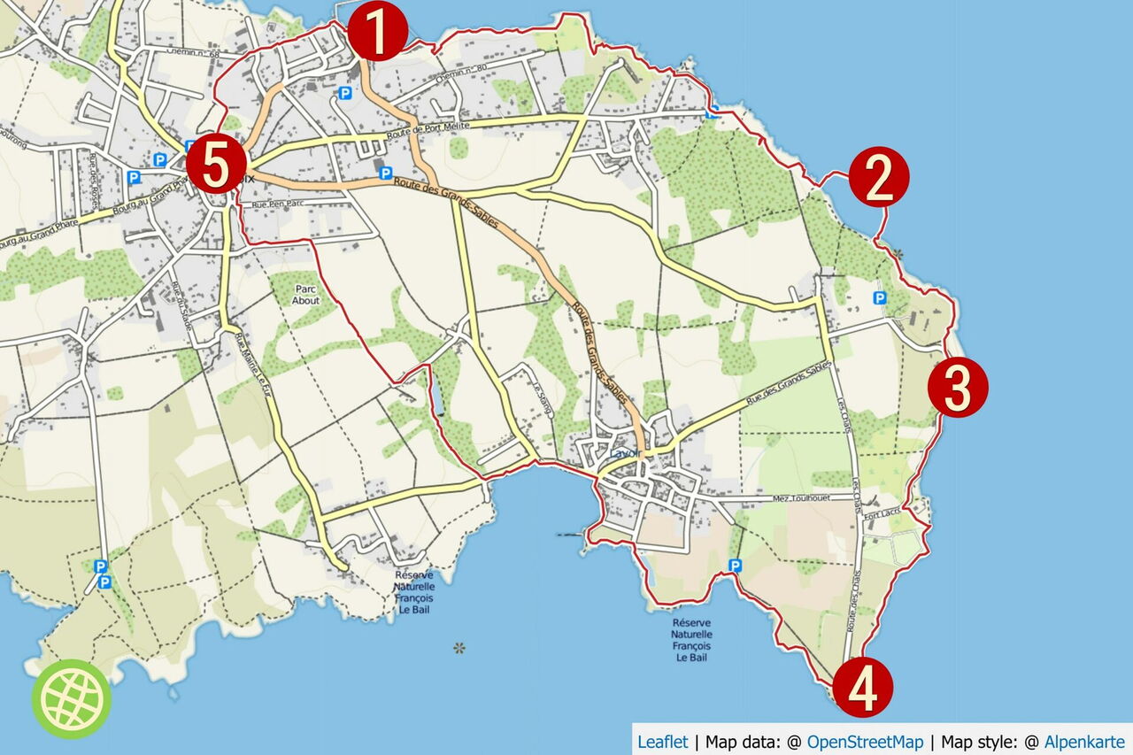 Bei einer Weggabelung gehen wir links bergauf. Nach Treppen, die bergab führen, kommen wir an der Pointe de la Groix oberhalb eines kleinen Leuchtturms vorbei. Hinter einer großen Freifläche gehen wir halb links auf der nachfolgenden Straße bergab und erreichen eine Feriensiedlung. Nach wenigen Metern entdecken wir die nächste Besonderheit der Insel am 03 Plage des Sables Rouges (9 m), nämlich den rot gefärbten Sandstrand. Hinter drei schönen Buchten steigt die Straße an, wir orientieren uns in Richtung des Landesinneren, aber bei einem großen Felsen biegen wir scharf links ab.