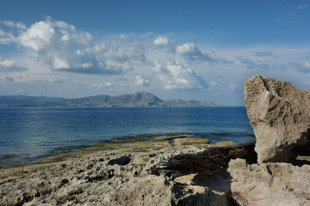 Hier gehen wir nicht geradeaus in Richtung des 190 m entfernten Mauerdurchbruchs, sondern halten uns halb links und gehen im weiteren Verlauf an den Überresten einer Mauer bis zu einer kleinen (03) Bucht (1 m) vor. Schauen wir Richtung Norden an der Küste entlang, so sehen wir die Strände Kalathos, Masari und Charaki. Im Hintergrund erkennt man den felsigen Berg Profitis Ilias und bei sehr guter Sicht sogar den dahinter liegenden Berg mit der Tsambika-Kapelle. Wir gehen 70 m direkt an der Küste mit ihren bizarren Sandsteinobjekten entlang, wechseln dann aber bei einer Minihöhle und den Überresten einer antiken Stätte auf die leicht ansteigende Steilküste.