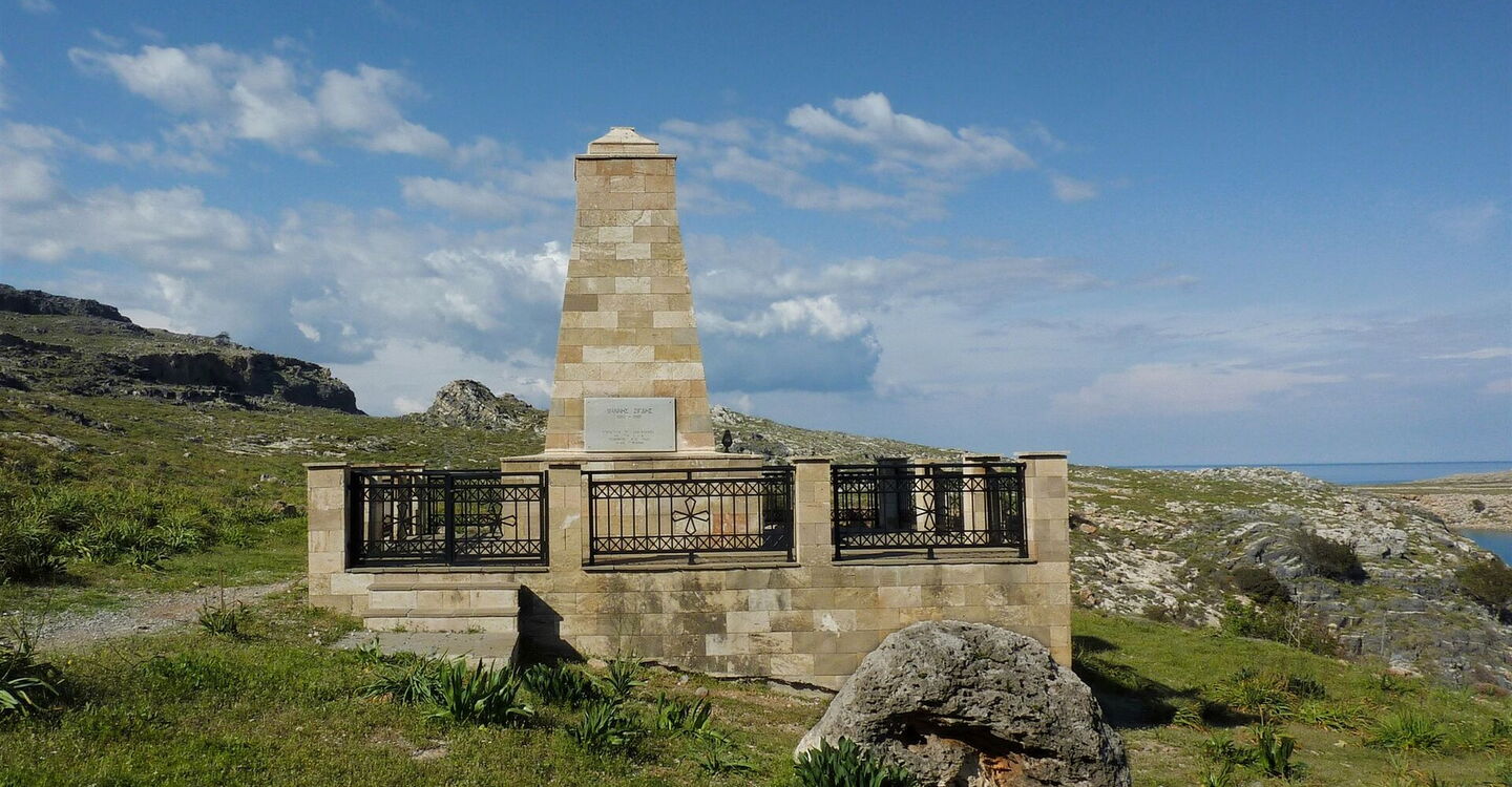 Am Parkplatz weisen bereits Wegweiser zur Grabstelle, die wir heute besuchen. Von der Pforte am (01) Parkplatz (33 m) gehen wir scharf rechts, dann entlang der Mauer oberhalb des Parkplatzes und vorbei am modernen Gedenkstein für Yannis Zigdis. Rechts unterhalb von uns liegt der wunderschöne Strand von Lindos und im Hintergrund das romantische Häusermeer.