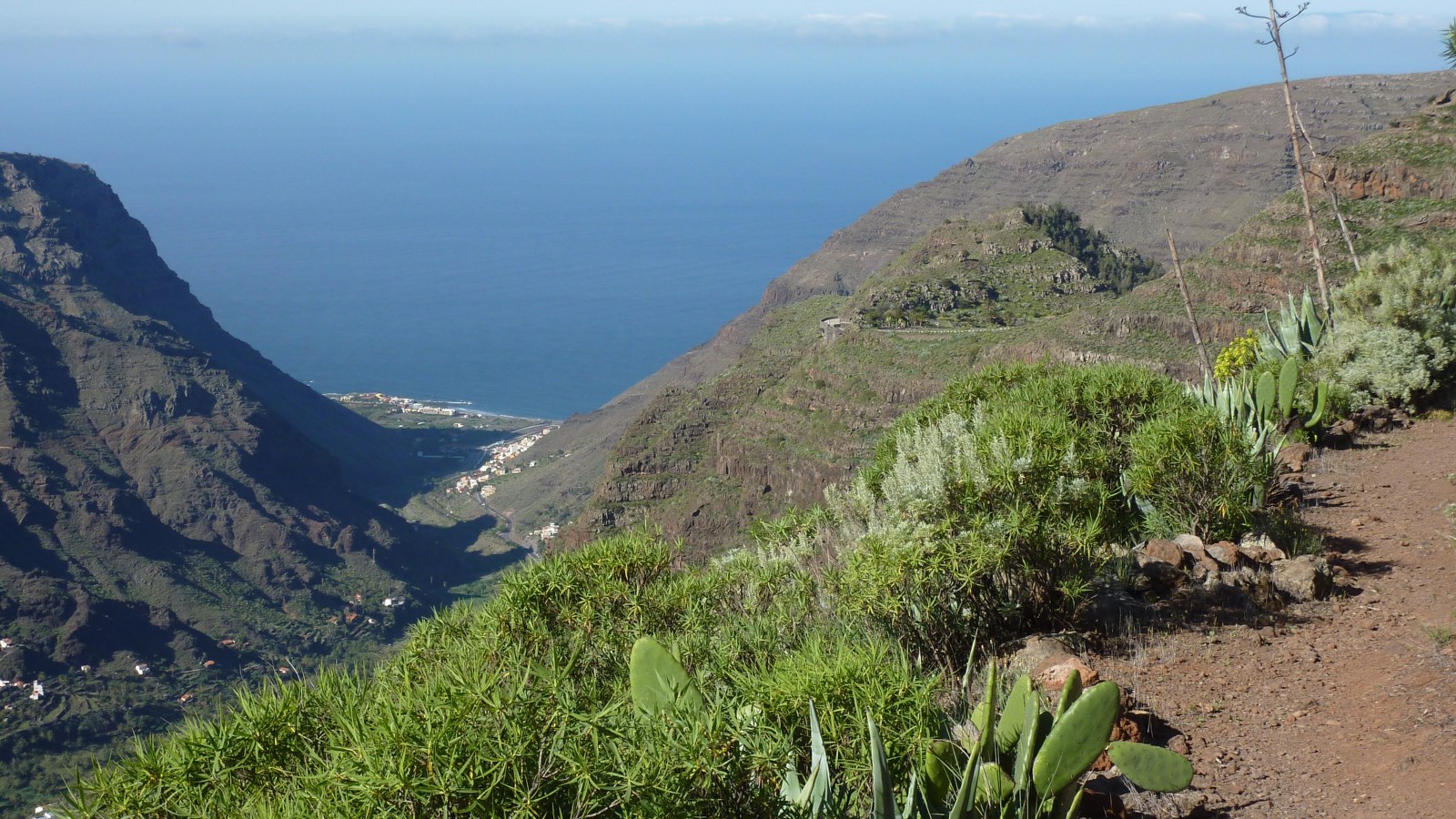 Der Weg endet und wir gehen auf dem nun breiten Wanderweg rechts bergab. Nach 300 m ergibt sich ein faszinierender Blick herunter in das (05) Valle Gran Rey (1015 m), in das 400 m tiefer liegende Barranco sowie links von uns auf die Fortaleza de Chipude. Der restliche Weg schraubt sich herunter Richtung Lomo del Balo, wo wir rechts auf der Asphaltstraße bis zum Ausgangspunkt gehen.