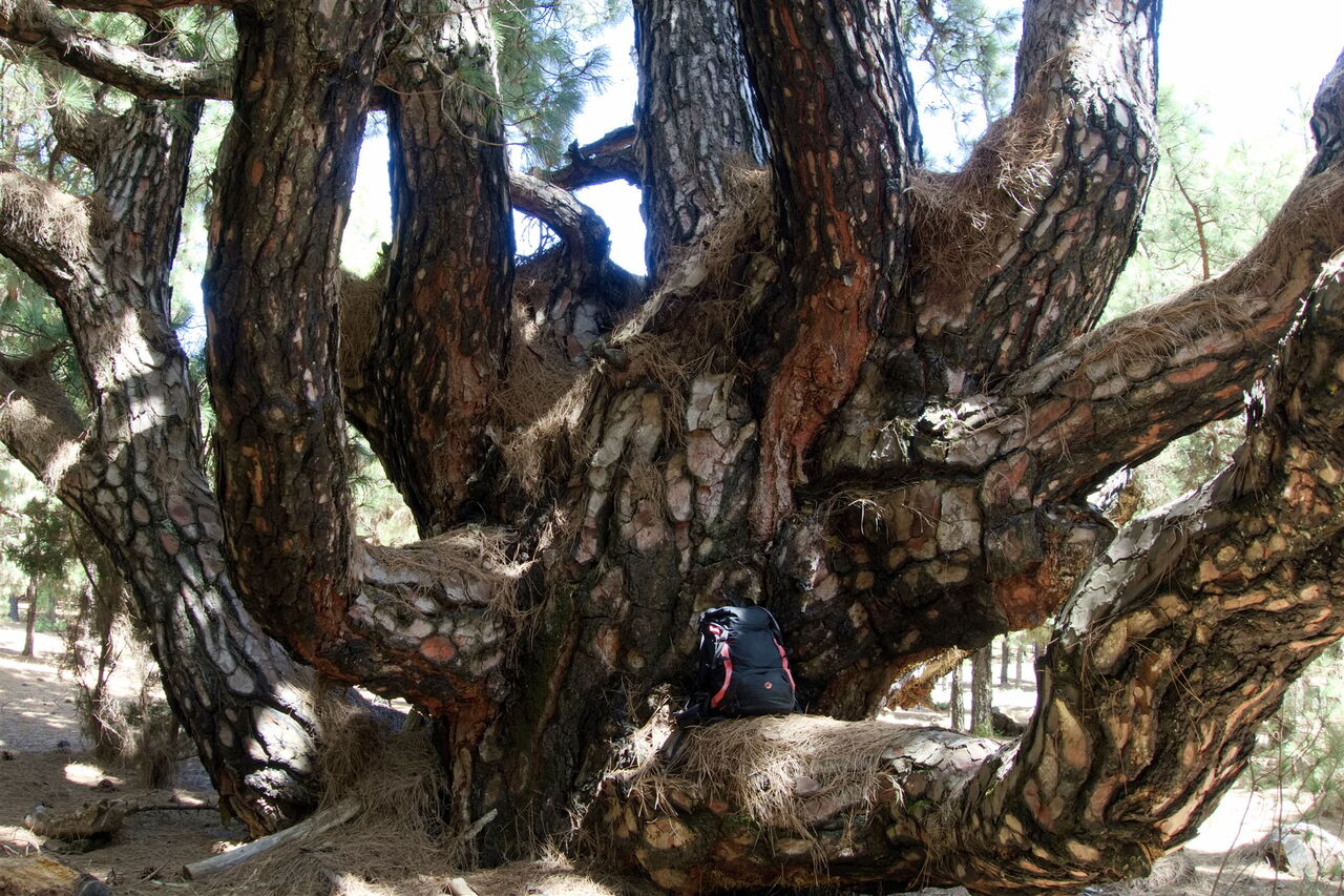 Kurz bevor unsere Piste in eine weitere mündet, führt auf der linken Seite ein Trampelpfad zur (02) ältesten Kiefer von El Hierro (1188 m). Aufgrund des langsamen Wachstums in dieser Region und eines unteren Stammdurchmessers von 2–3 m wird sie auf 400–600 Jahre geschätzt; ein wahres Juwel mit ihren tentakelartigen und mächtigen Ästen. Wieder auf der Forststraße wandern wir bei der Fuente de Julan auf dem rechten bergauf führenden Weg Richtung Cruz de Los Reyes und Sabinosa. Nach steilem Aufstieg erreichen wir eine Weggabelung. Hier nehmen wir den halblinken Abzweiger, kommen vorbei an der Fuente Cruz de Los Reyes und queren im weiteren Verlauf eine Straße. Bei der Dreiwegegabelung entscheiden wir uns für den mittleren Weg, der in Richtung der ausgeschilderten Parkplätze führt. Noch vor der großen freien Fläche orientieren wir uns rechts bergauf, um an der Asphaltstraße links zu gehen.