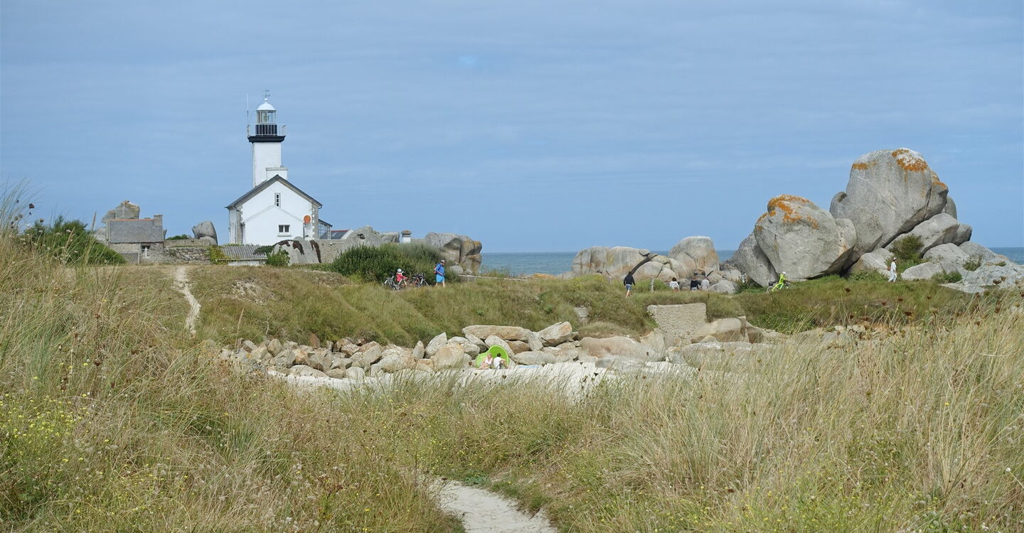 Gegenüber dem großen Parkplatz befinden sich das Museumsdorf und die Gaststätte 01 Auberge de Meneham (5 m). Wir gehen auf der Anfahrtsstraße landeinwärts in Richtung des riesigen Sendemasts. Anschließend ignorieren wir den linken Abzweiger und kommen vorbei an riesigen Felsen, die in den Vorgärten der Häuser stehen. Bei einem kleinen Wasserauffangbecken biegen wir halb links auf einen leicht ansteigenden Pfad ab, der durch die Felsen führt. Es geht an Einfamilienhäusern vorbei und bei dem gelben Haus mit roten Fensterläden halten wir uns links, wir gehen wieder auf einen riesigen Felsen zu. Dann laufen wir direkt über ein Feld auf einzelne Felsen zu. Halb links hinter der Straße befindet sich der weiterführende Pfad. Hinter einem weiteren Wasserauffangbecken mündet der Pfad in eine Straße. Dort, wo sie endet – bei einem steinernen Kreuz –, gehen wir links. Beim Vorfahrtsschild gehen wir dann rechts, bei der nächsten Möglichkeit links und an dem gelben Haus vorbei. Hinter einer weißen Schranke verlassen wir die Straße nach links und gehen auf dem Feldweg, bis wir bei der nächsten Weggabelung halb rechts gehen. Bei dem nächsten Abzweiger gehen wir links – hier befindet sich auch ein Holzpfeiler.