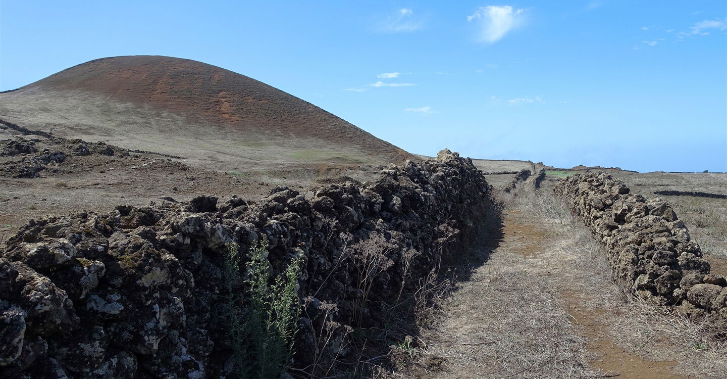 Bei einem Felsen angekommen, ergibt sich ein gigantischer Blick in das 1000 Höhenmeter tiefer liegende Halbrund des El-Golfo-Tals. Es folgt der spektakulärste Teil der Wanderung, die (03) Gratwanderung (1100 m) oberhalb des Risco de Tibataje – definitiv nichts für schwache Nerven. Naja, Trittsicherheit und Schwindelfreiheit – das muss an dieser Stelle noch einmal gesagt werden – sind essenziell. Gleich auf dem ersten Abschnitt müssen wir den ursprünglichen Pfad umlaufen, denn dieser ist nach einem Erdrutsch nicht mehr vorhanden. An vielen Stellen ist der Pfad am Abgrund stark verwachsen, so kann man über die Trockensteinmauer steigen und auf den Feldern und Wiesen parallel zum Abgrund gehen.