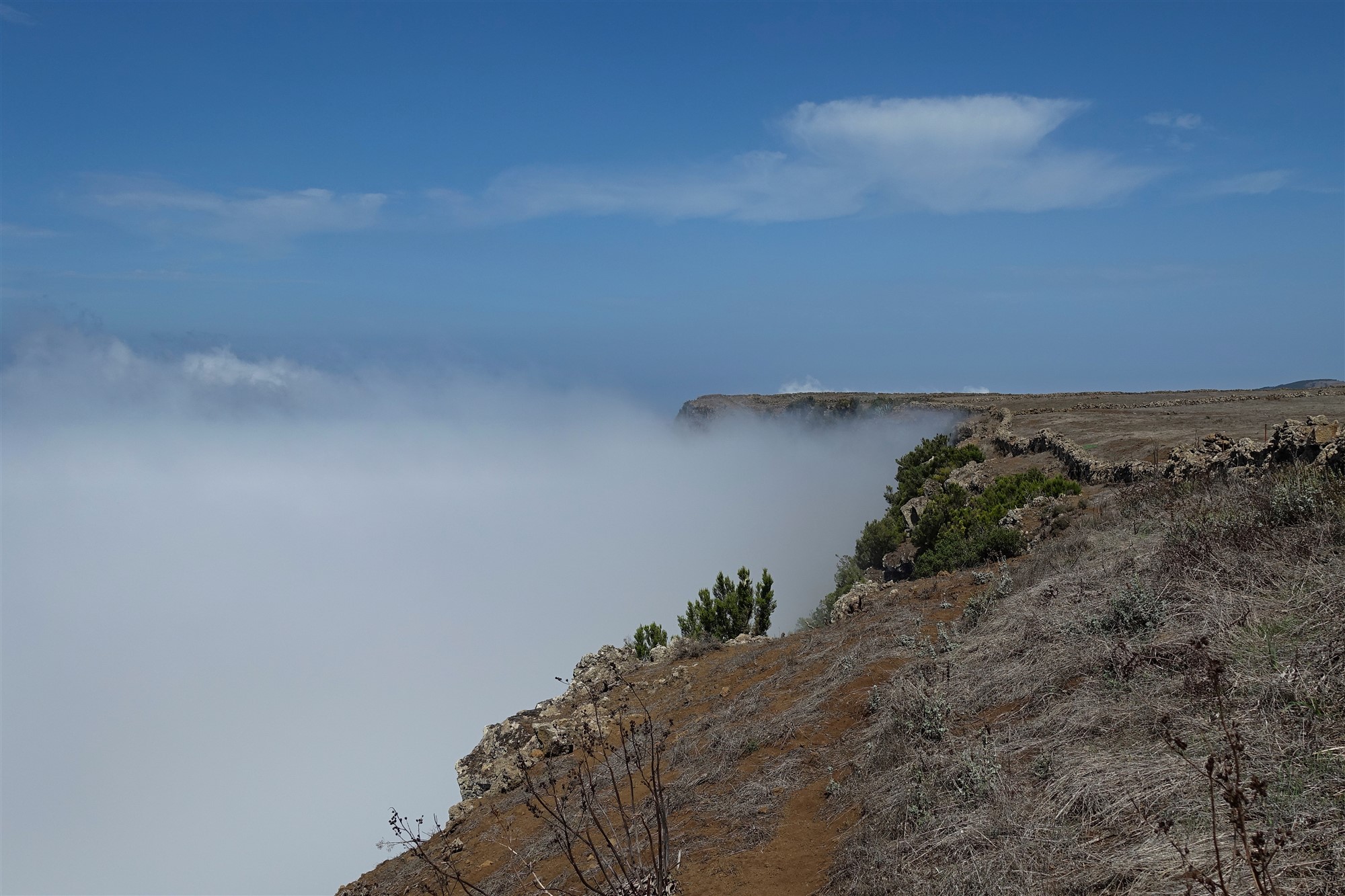 Die Meseta-de-Nisdafe-Hochebene ist in ihrem Wechselspiel aus verdorrtem Land in den Sommermonaten und fruchtbaren sattgrünen Weiden im Winter und im Frühjahr einmalig auf den Kanarischen Inseln. Sie liegt im Einflussbereich der Passatwolken, die zusätzlich in den Wintermonaten der Landschaft etwas Mystisches verleihen. Geht man in diesem wunderbaren Wandergebiet noch am oberen Rand einer 1100 m steil abfallenden Felswand, so sind dies die perfekten Zutaten für eine der erlebnisreichsten Wanderungen auf El Hierro. Ein Weg der Langsamkeit, um all die Eindrücke und Gedanken zu ordnen.