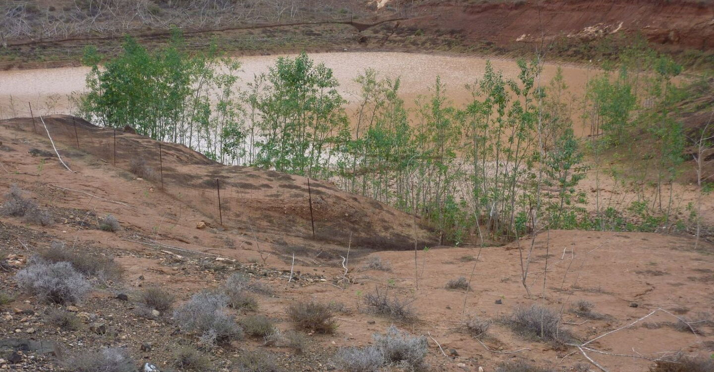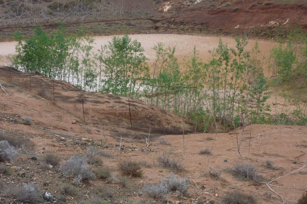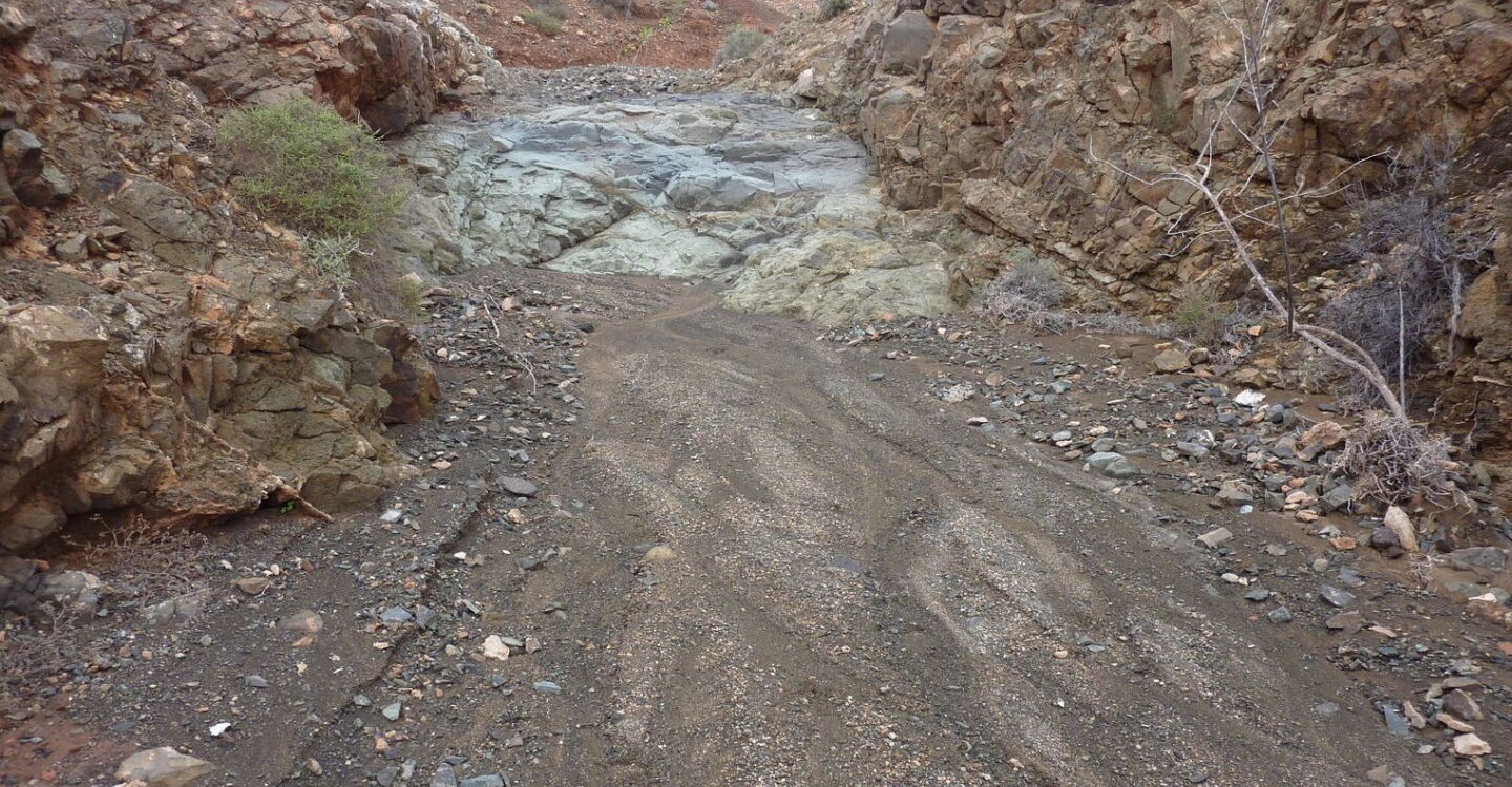 Die ersten paar Meter im Barranco sind noch steinig, aber immer mehr Zuflüsse von rechts und links formen sehr schnell ein breites sandiges Barranco, in dem es nun bequem und leicht bergab weitergeht. Es folgen kleine Wasserfälle, die einfach überwunden werden können – inzwischen ist das Barranco 3 m breit geworden. Wir treffen auf einen markanten Felsen, der quer im Barranco liegt. Nach weiteren 60 m führt von links ein weiteres Barranco in den Hauptstrom. An dieser Stelle, ca. 200 m vor einer künstlich angelegten (04) Staustufe (342 m), verlassen wir das Barranco auf eine zunächst schwer auszumachende Schotterpiste. Sie führt parallel zum nun tiefer liegenden Barranco, direkt zu auf einen künstlich angelegten Staudamm. Nach 130 m und einer langen Linkskehre ändert sich die Wegrichtung auf Nord. Wir gehen nun direkt auf einen weiteren Staudamm zu. Bei der folgenden Weggabelung wandern wir links, bis wir zu einem Barranco gelangen, das den oberen Staudamm nährt.
