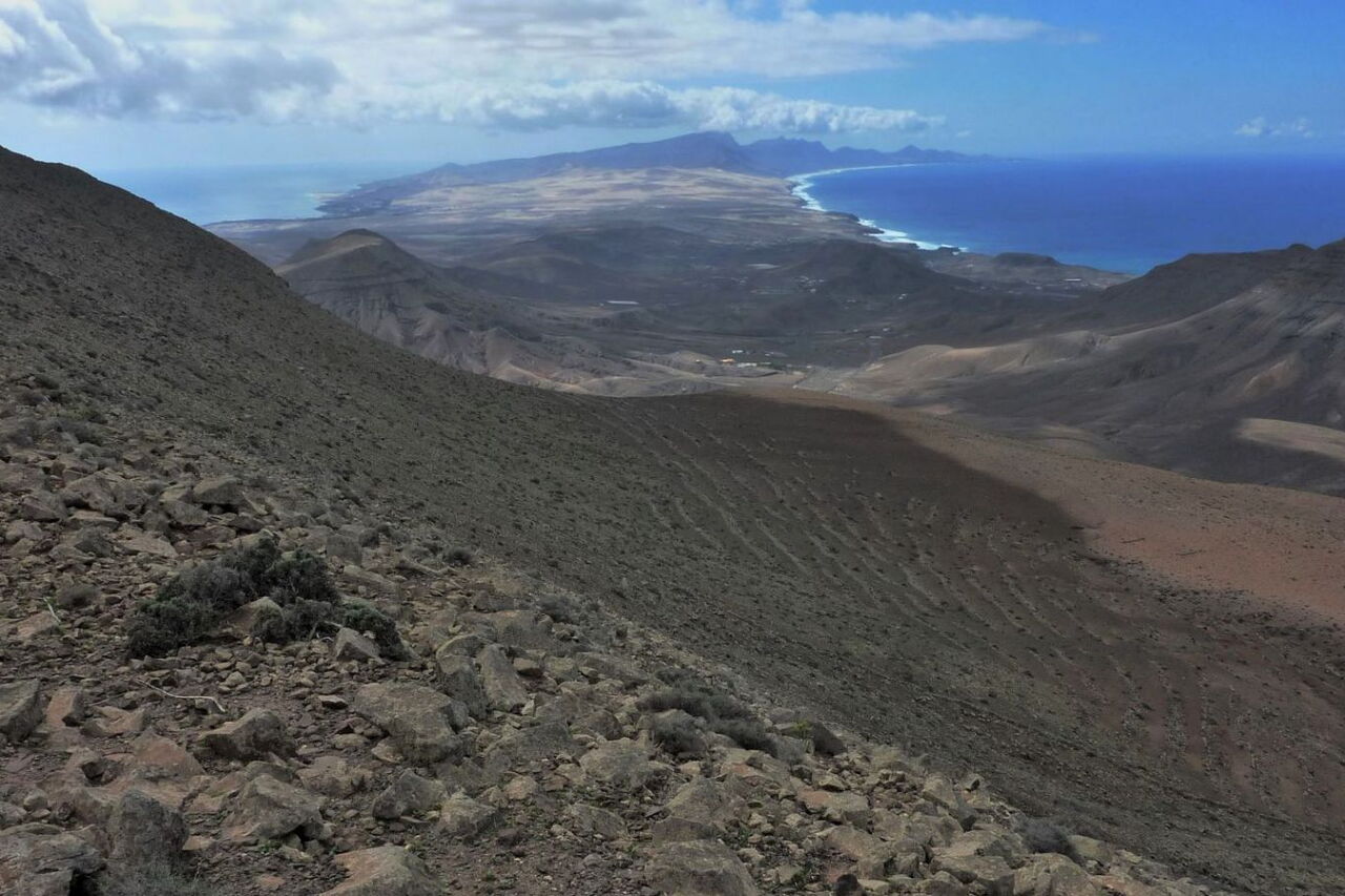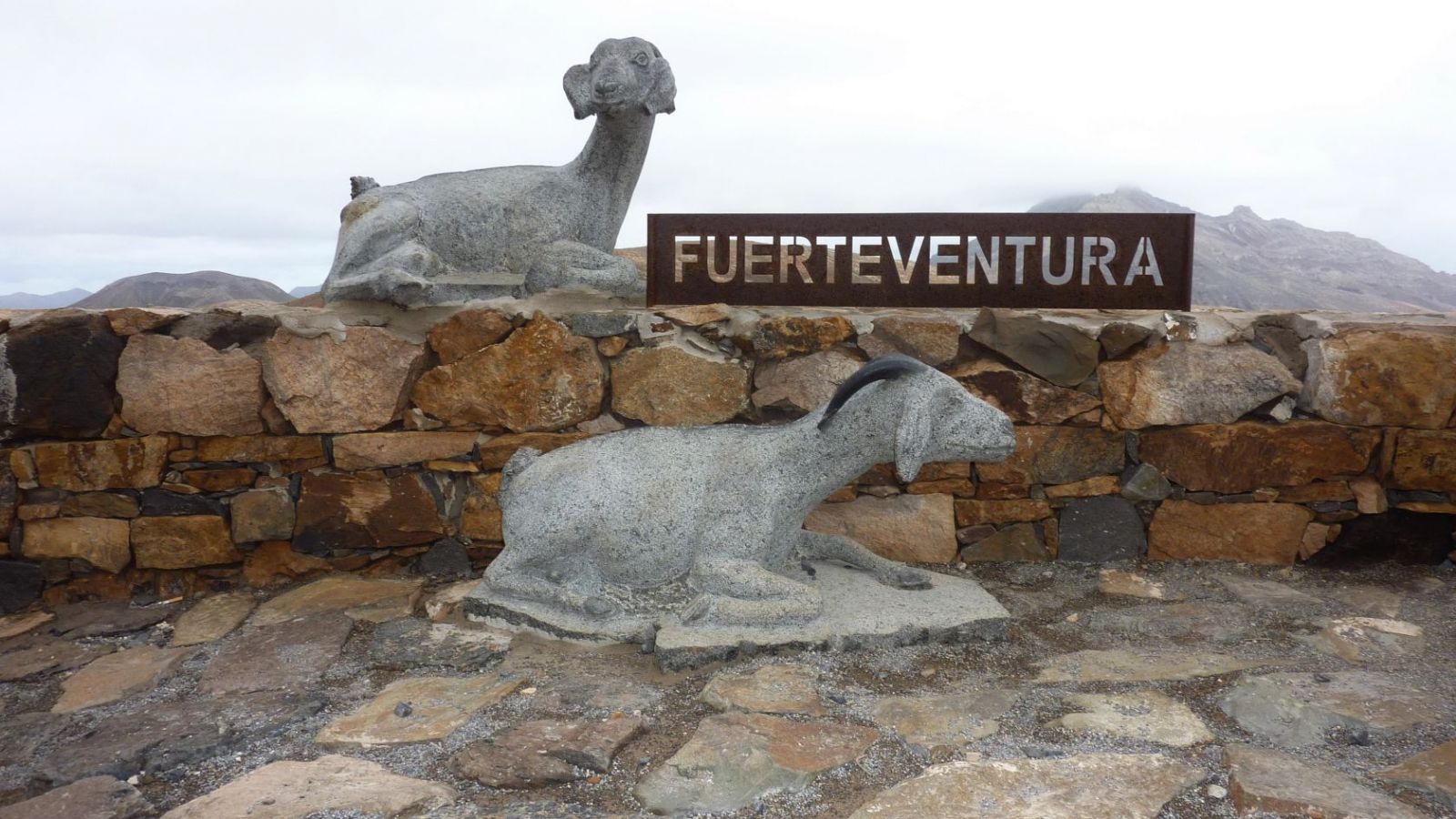 Nach nur 60 Höhenmetern und 410 m Entfernung ist bereits der Mirador (02) Astronomico de Sicasumbre (461 m) erklommen. Am Mirador aufgestellte Ziegenskulpturen des bekannten Bildhauers Juan Miguel Cubas ergeben das perfekte Szenario für ein Urlaubsfoto: im Vordergrund die Ziegen mit Familie und am Horizont die Jandia-Halbinsel mit dem gewaltigen Jandia-Bergmassiv. Am Mirador, direkt neben dem fest installierten Fernrohr und einem kleinen Steinhäufchen, führt auf dem vor uns liegenden Bergrücken ein schmaler Pfad in südliche Richtung talwärts.
